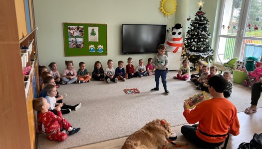 Przedszkolaki podczas kolejnych zajęć z pieskiem Fargo utrwalały zasady bezpiecznej relacji ze zwierzęciem- prawidłowego podchodzenia do psa...