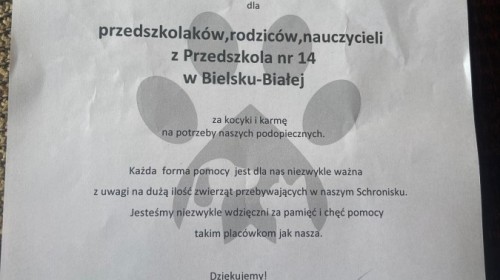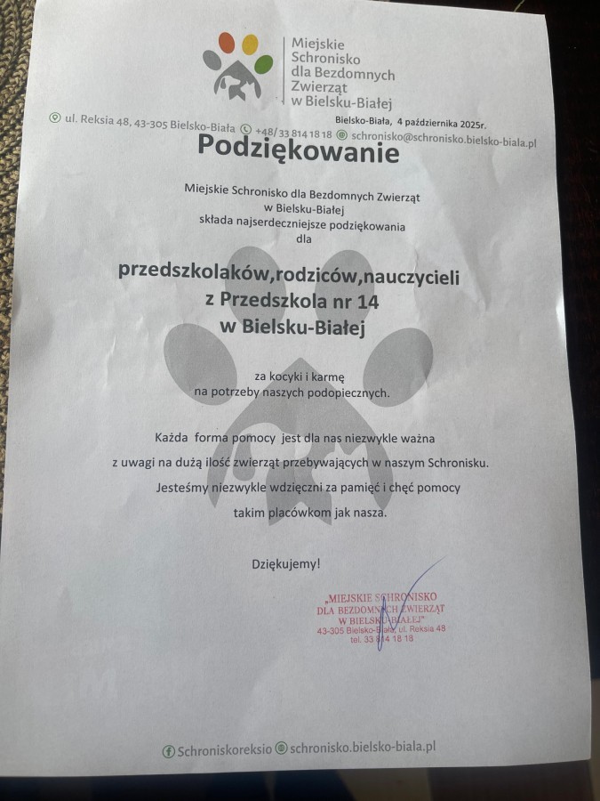 Pracownicy Przedszkola nr 14 oraz pracownicy Schroniska "Reksio" składają serdeczne podziękowania wszystkim osobom, które wsparły akcję pomocy zwierzętom. Dzięki Państwa dobroci i zaangażowaniu udało się zebrać karmę, koce oraz inne potrzebne rzeczy, które pomogą podopiecznym schroniska " Reksio" przetrwać nadchodzącą zimę w cieple i z pełnymi brzuszkami. Wasza empatia, wrażliwość i otwarte serca są ogromnym wsparciem i dowodem na to, że razem możemy uczynić wiele dobrego. Z całego serca- dziękujemy! :)