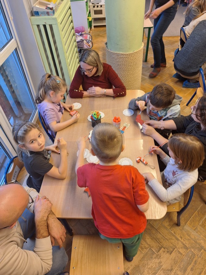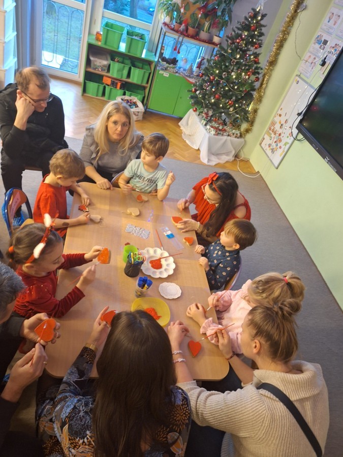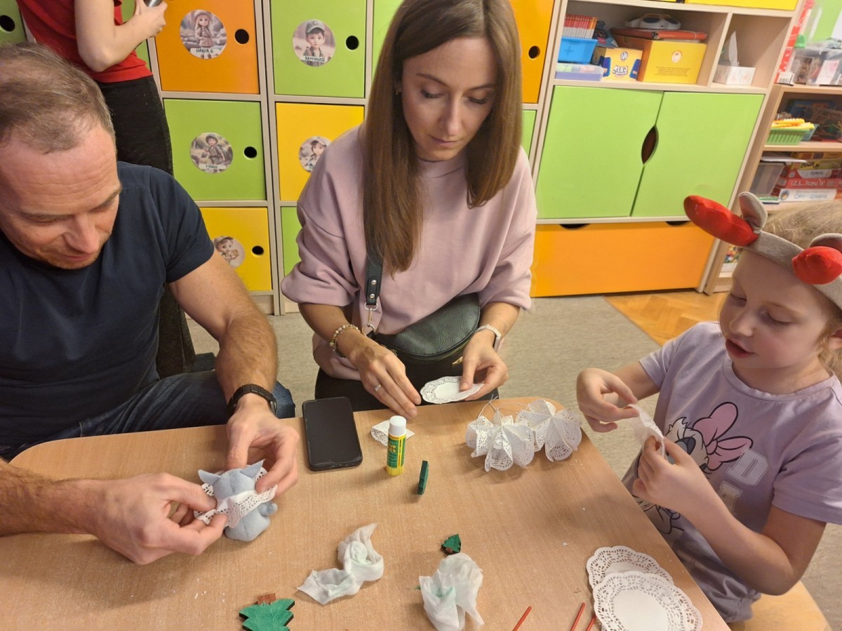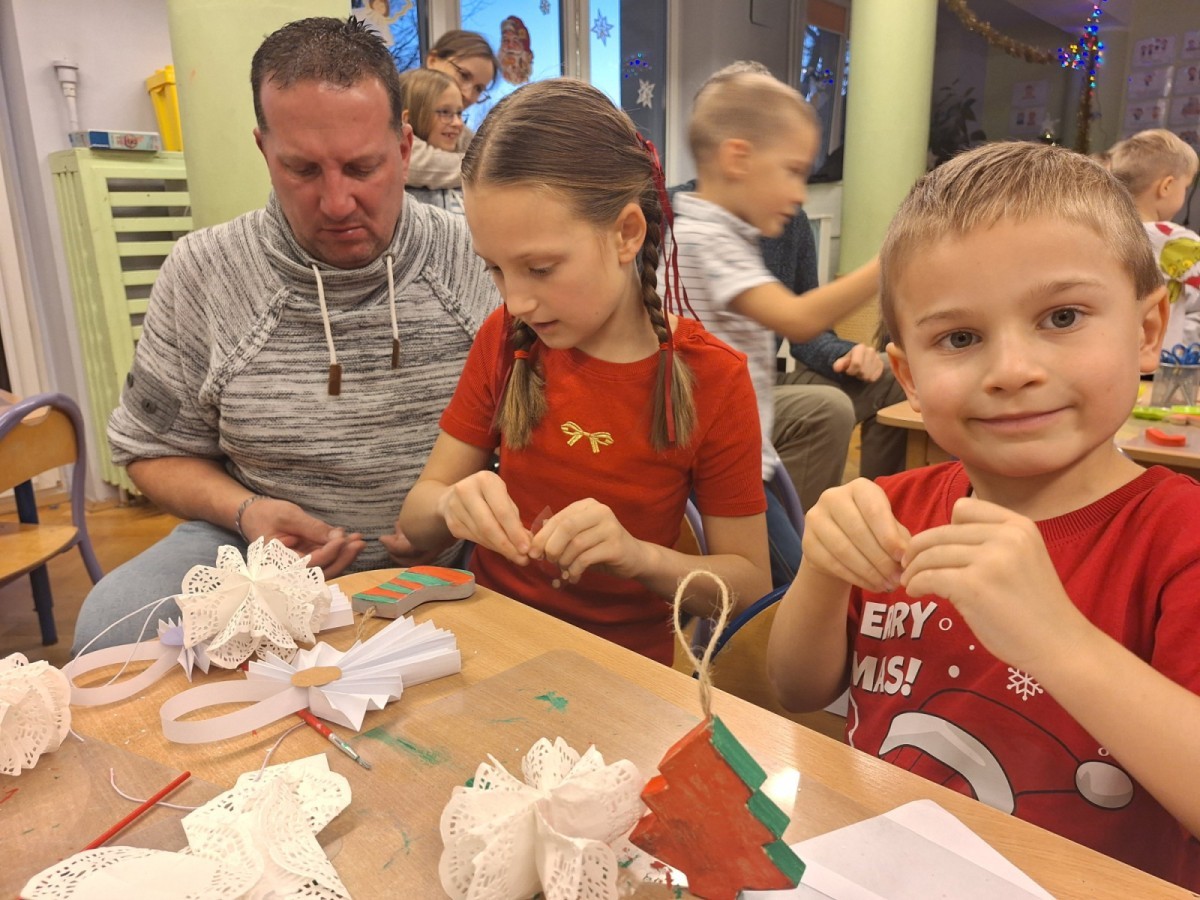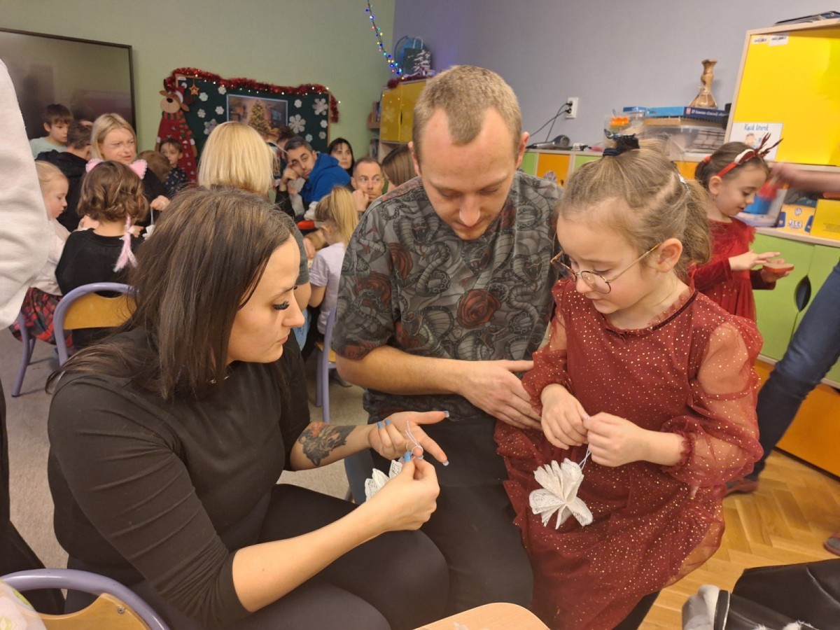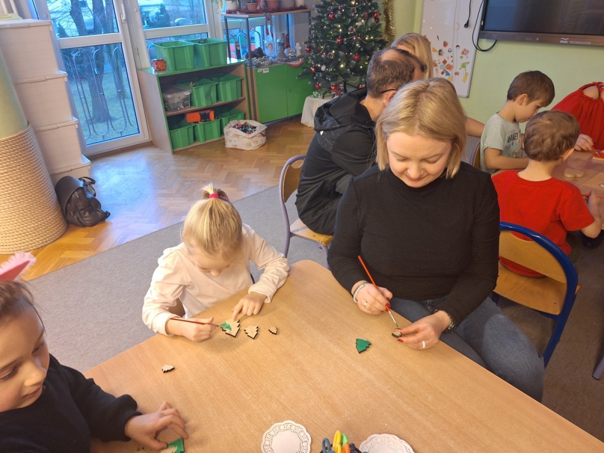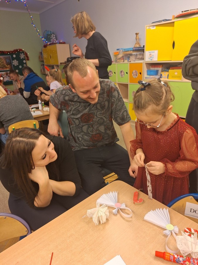 Dzisiejsze spotkanie świąteczne rozpoczęliśmy od pięknych i wzruszających występów dzieci, następnie zaprosiliśmy Rodziców do części plastycznej- malowaliśmy drewniane zawieszki, wykonaliśmy gwiazdki z serwetek oraz aniołki z papieru.
