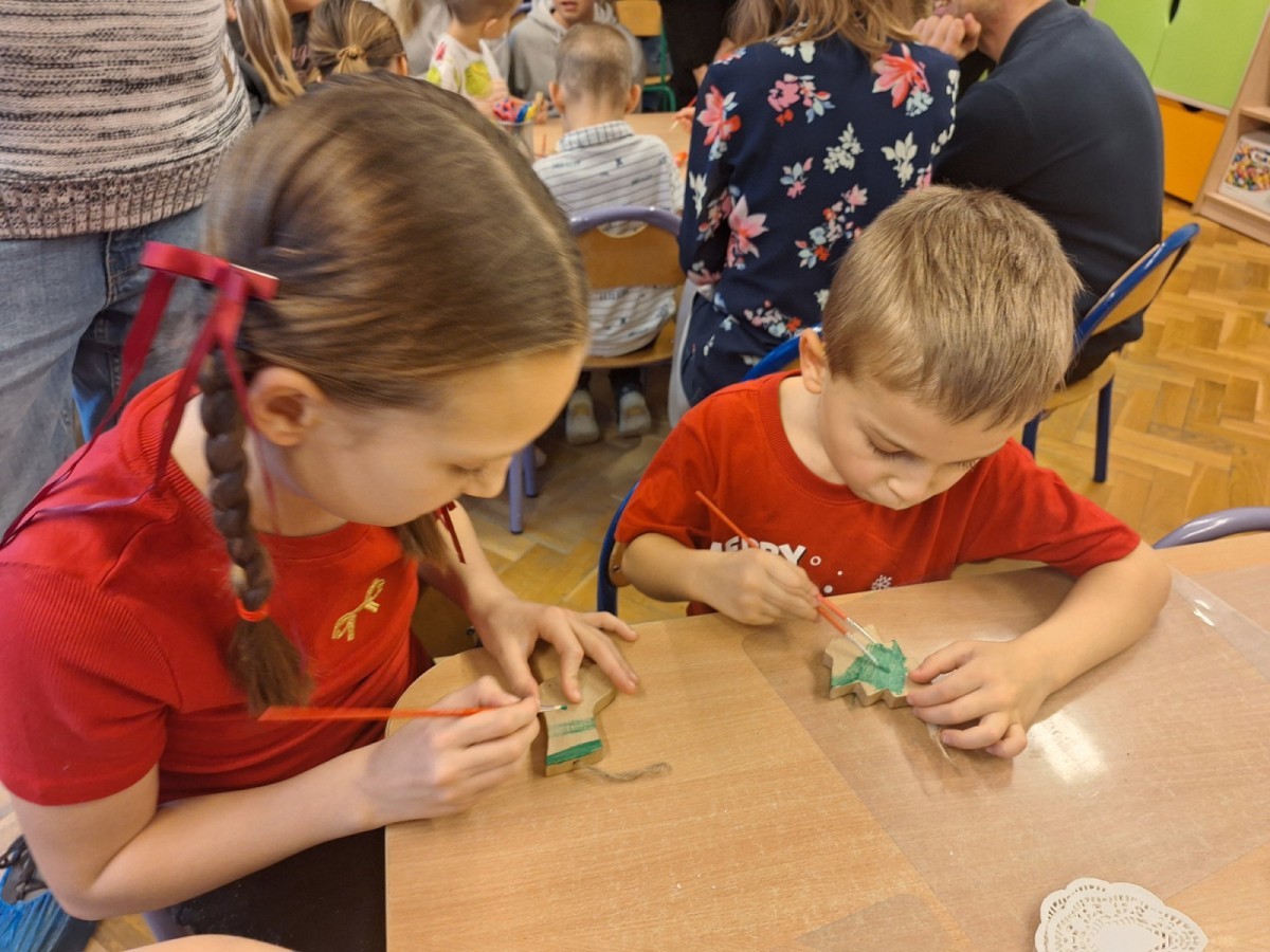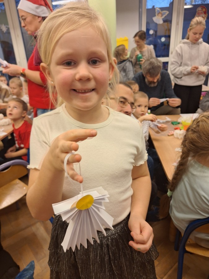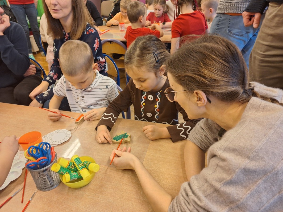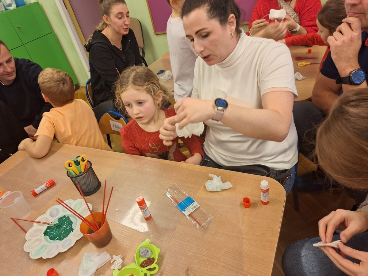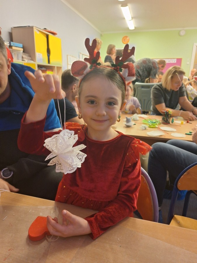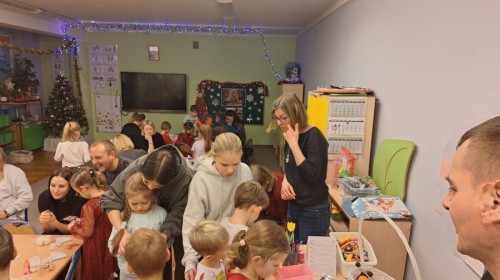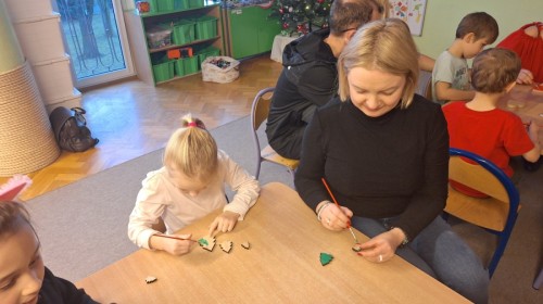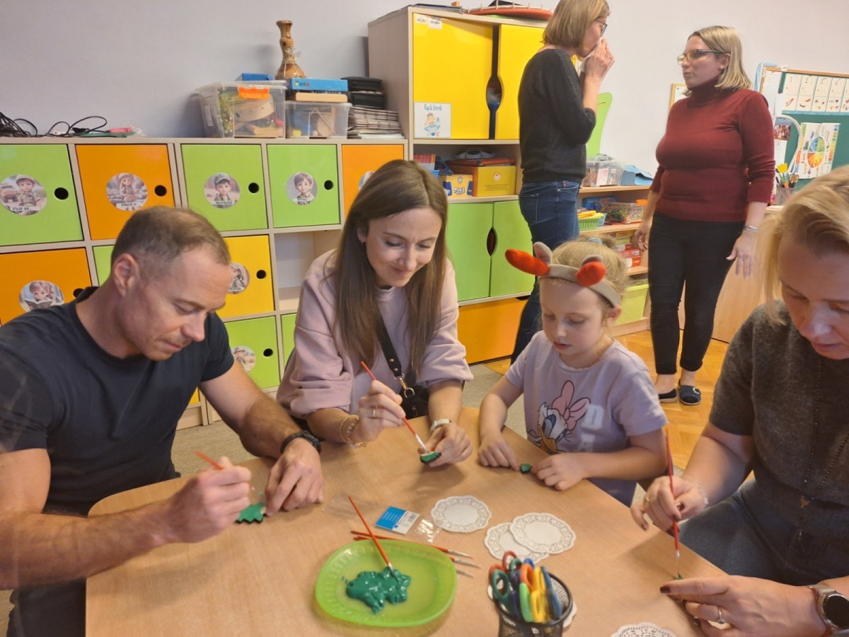 Dzisiejsze spotkanie świąteczne rozpoczęliśmy od pięknych i wzruszających występów dzieci, następnie zaprosiliśmy Rodziców do części plastycznej- malowaliśmy drewniane zawieszki, wykonaliśmy gwiazdki z serwetek oraz aniołki z papieru.