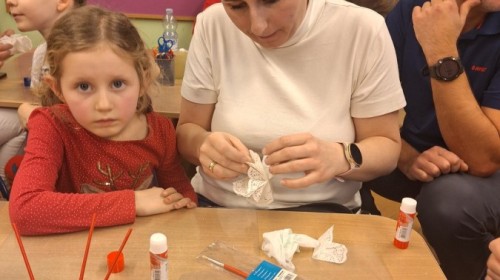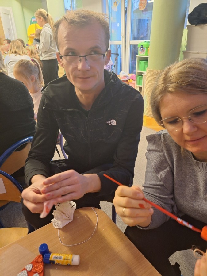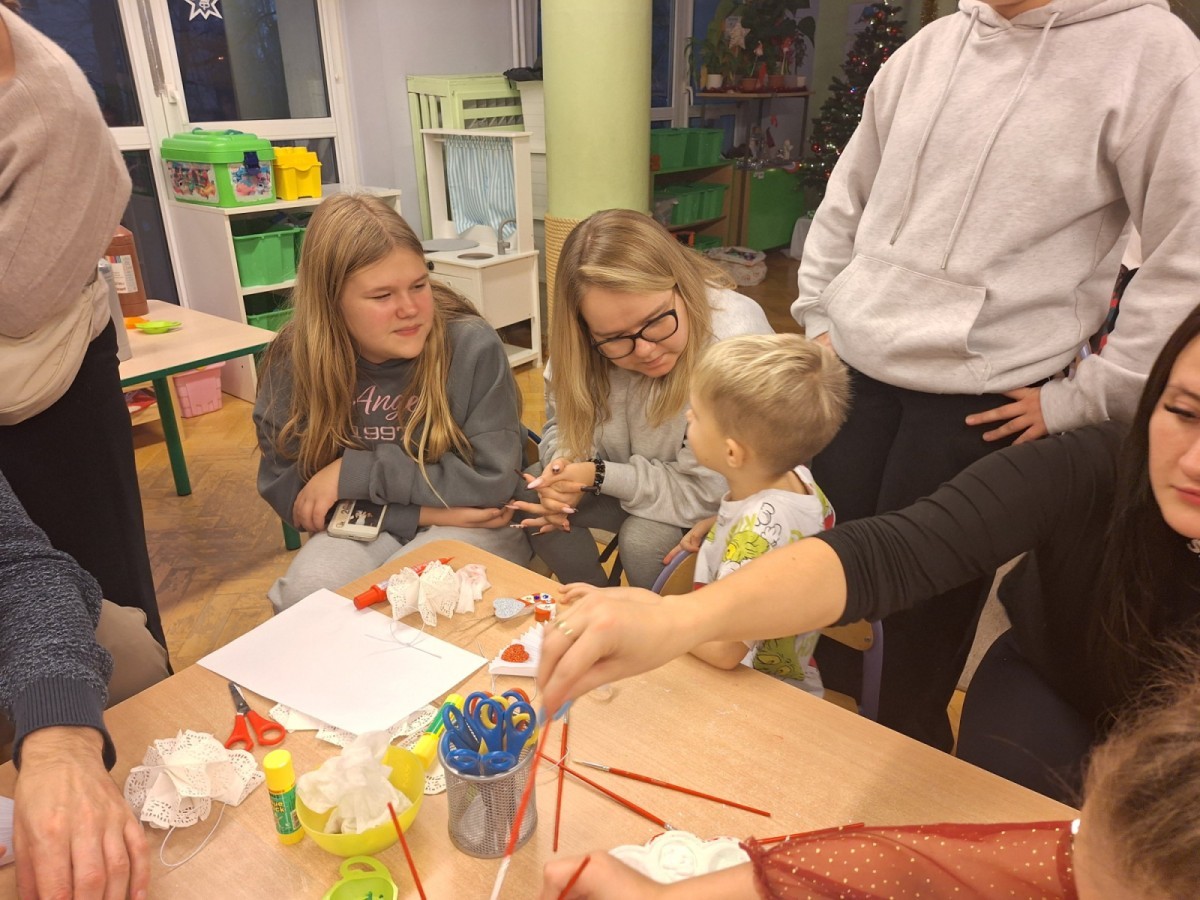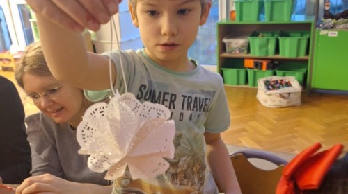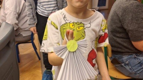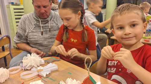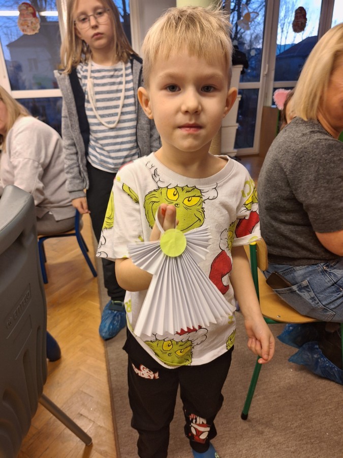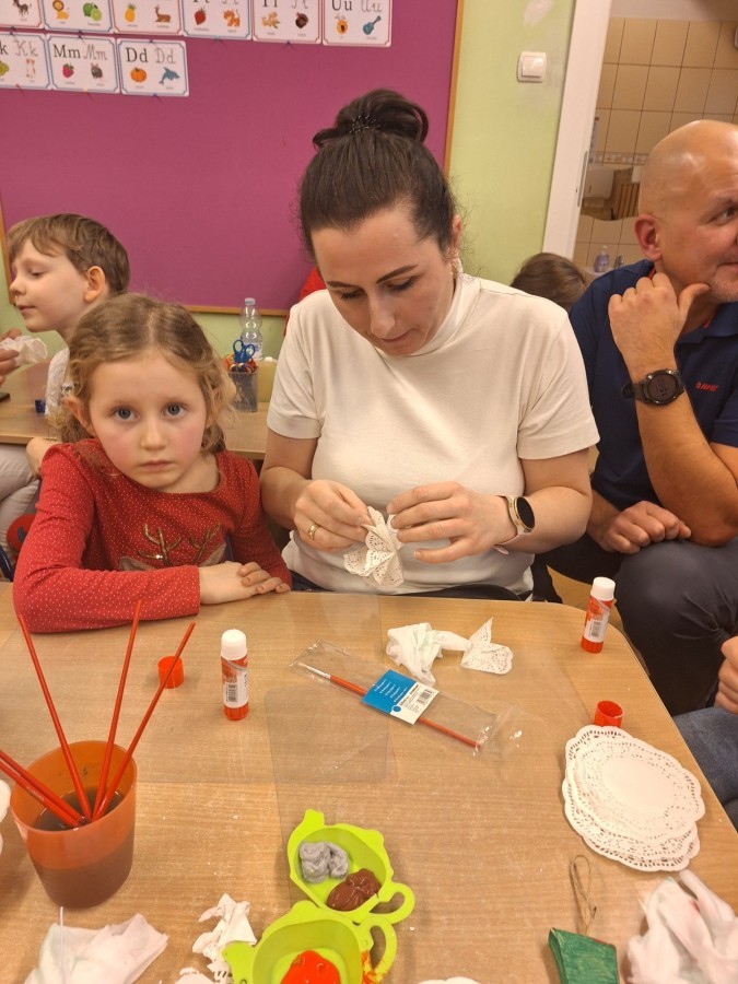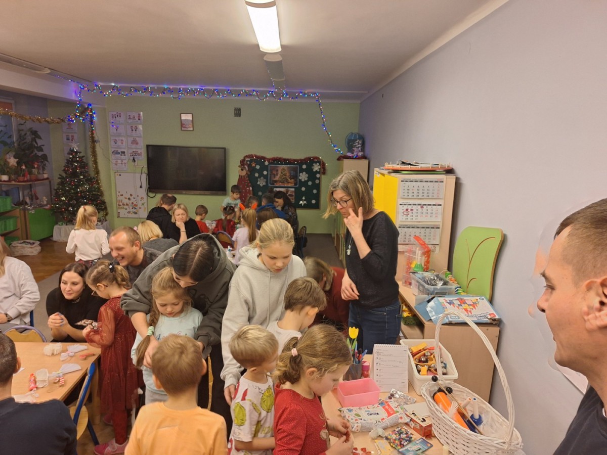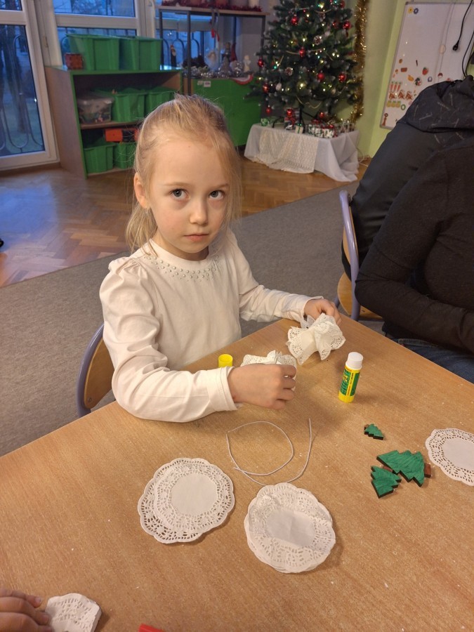 Dzisiejsze spotkanie świąteczne rozpoczęliśmy od pięknych i wzruszających występów dzieci, następnie zaprosiliśmy Rodziców do części plastycznej- malowaliśmy drewniane zawieszki, wykonaliśmy gwiazdki z serwetek oraz aniołki z papieru.