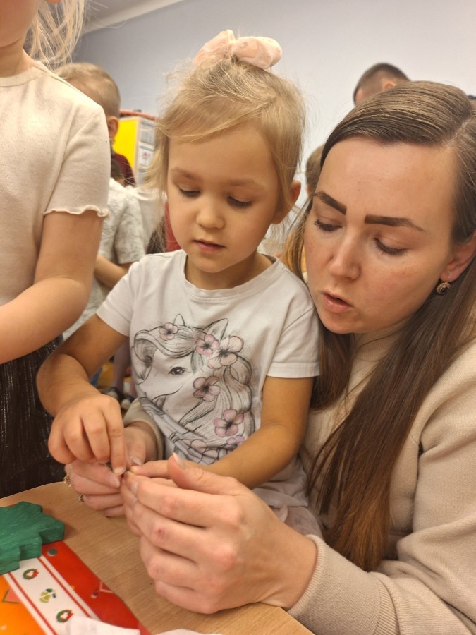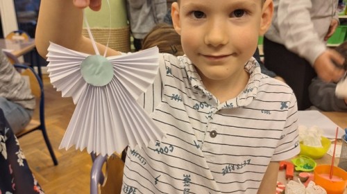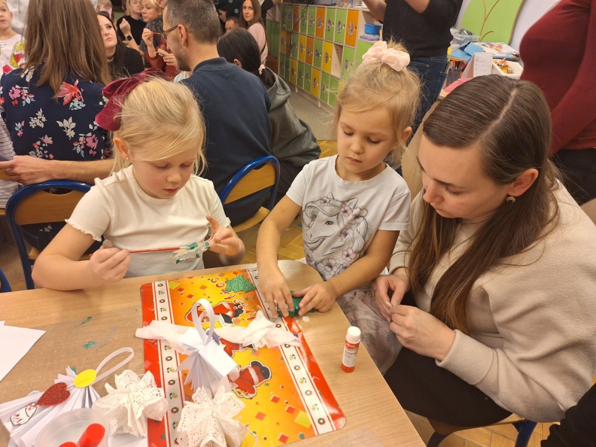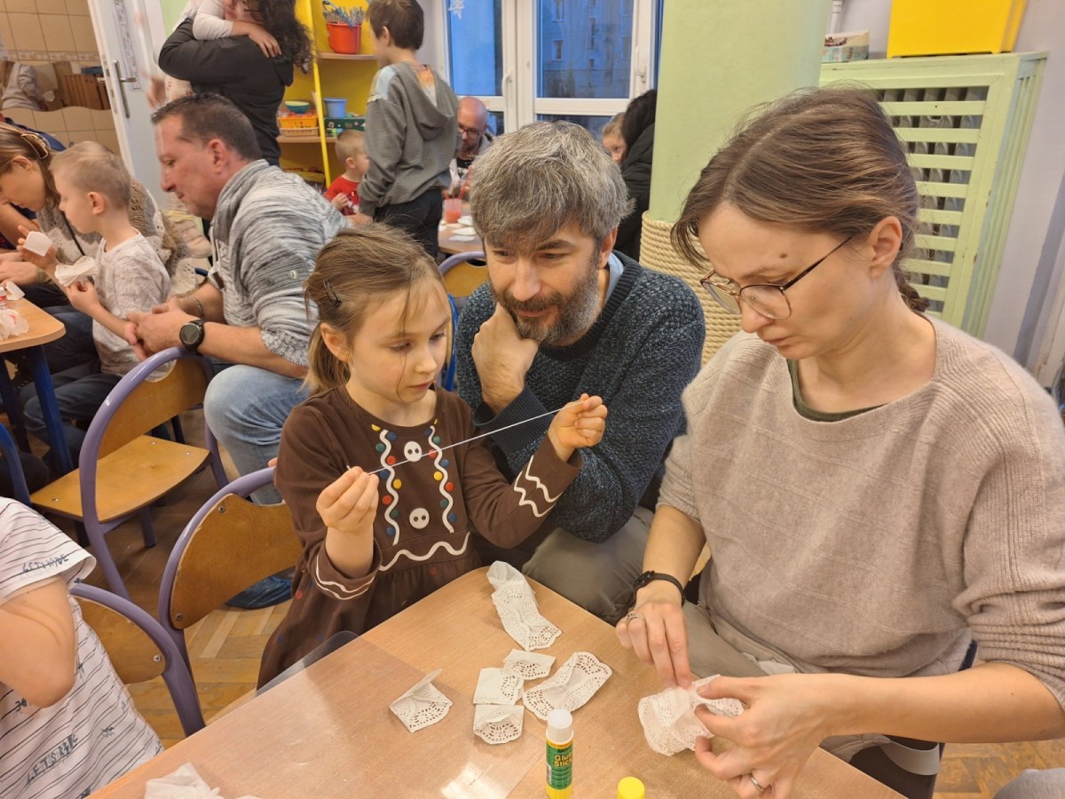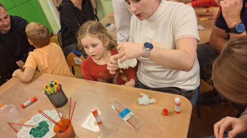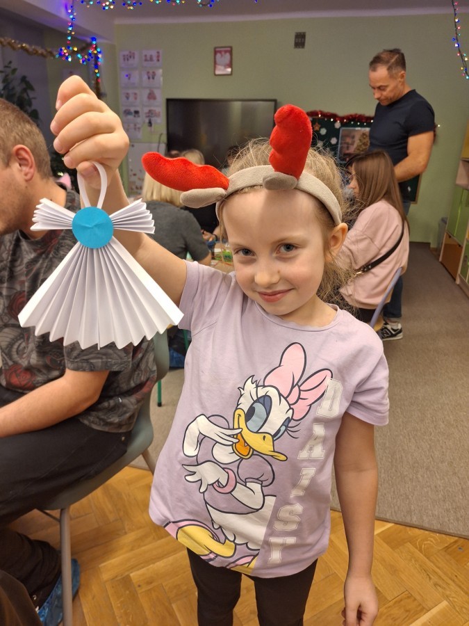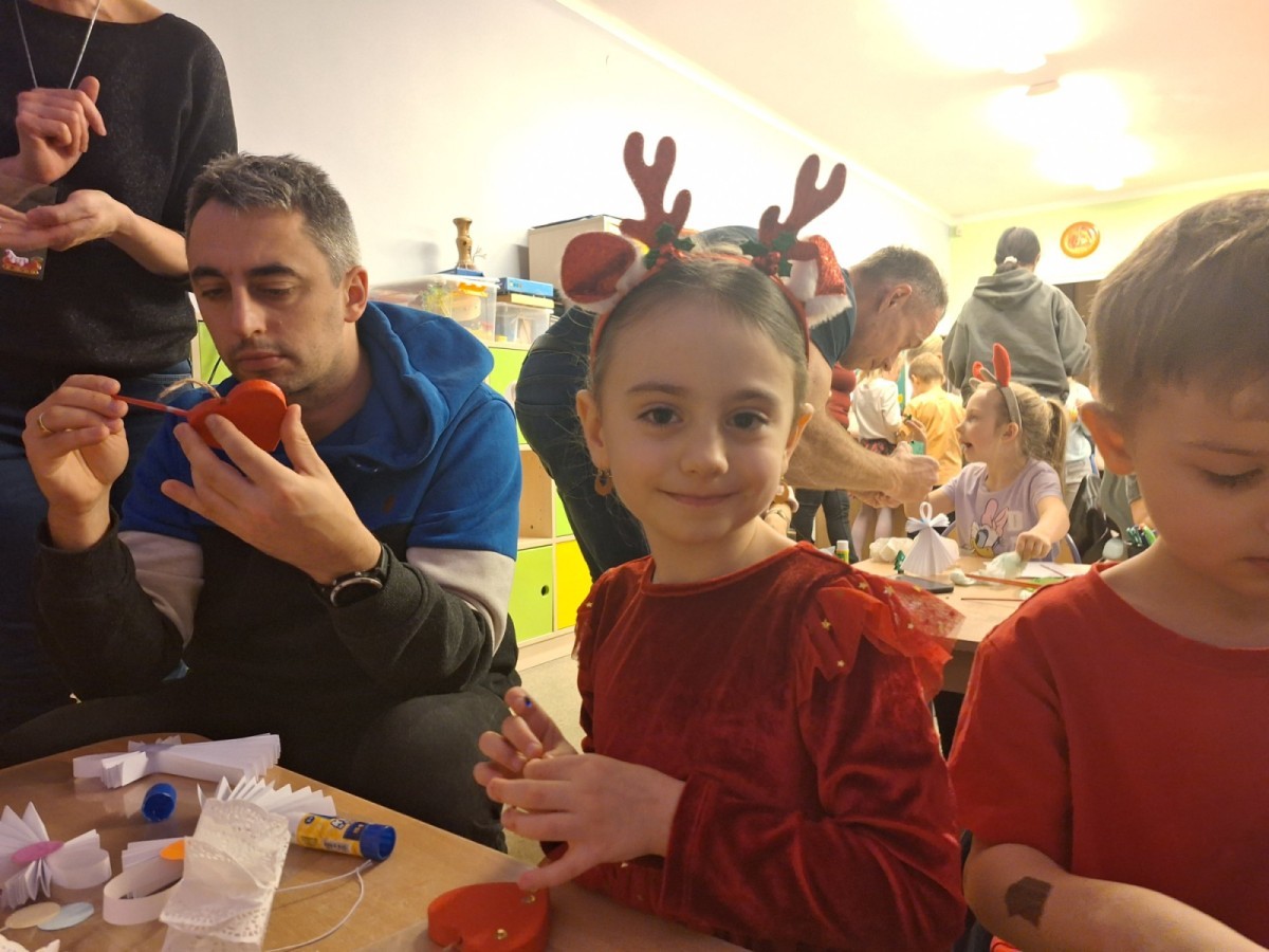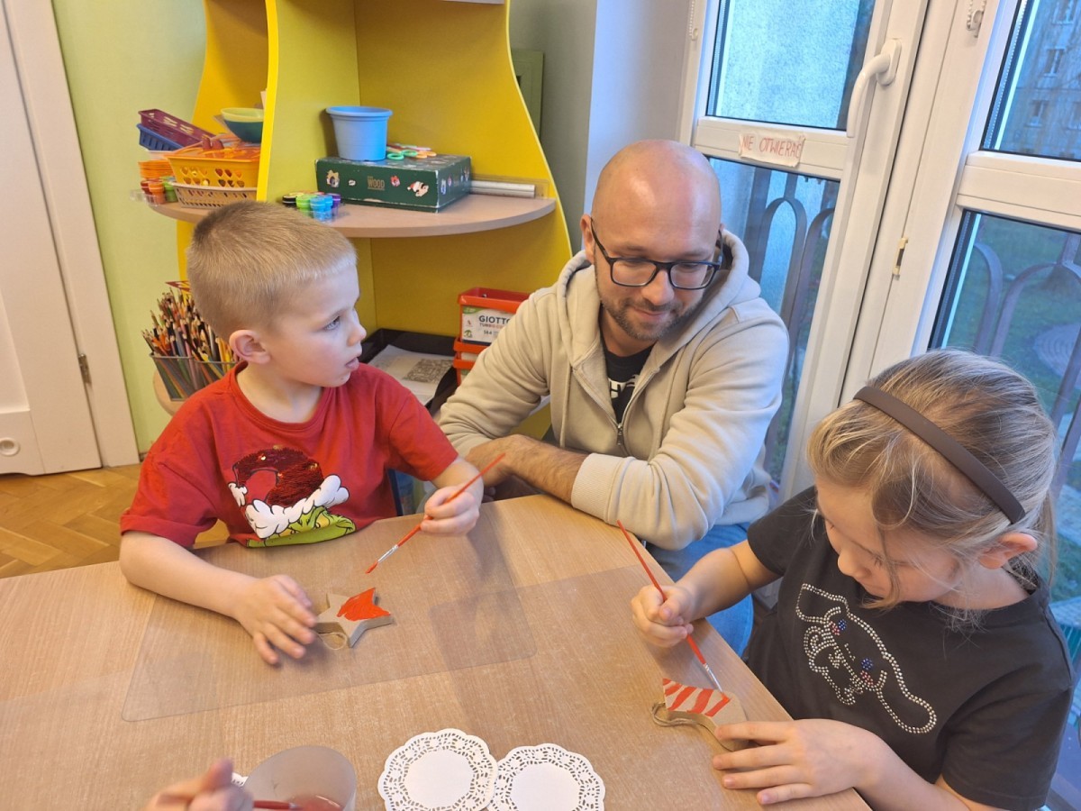 Dzisiejsze spotkanie świąteczne rozpoczęliśmy od pięknych i wzruszających występów dzieci, następnie zaprosiliśmy Rodziców do części plastycznej- malowaliśmy drewniane zawieszki, wykonaliśmy gwiazdki z serwetek oraz aniołki z papieru.