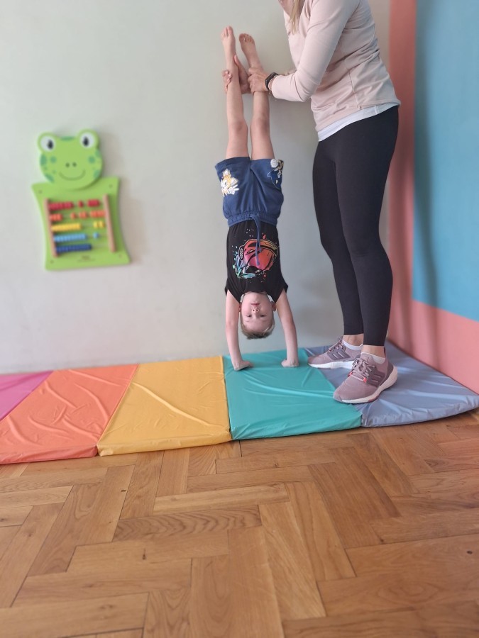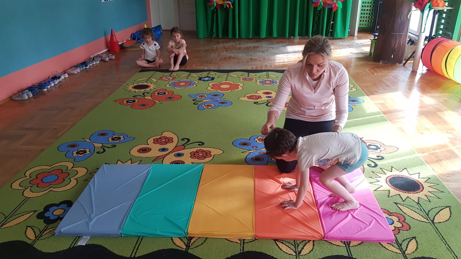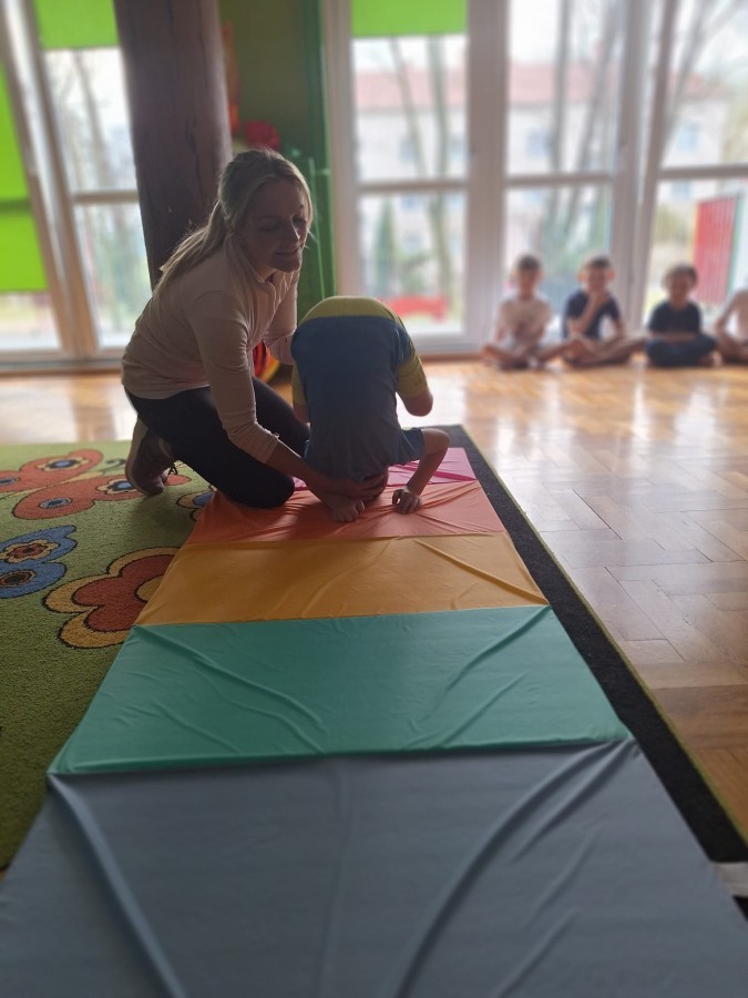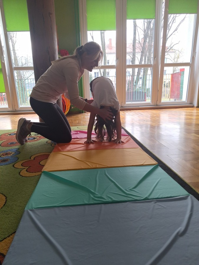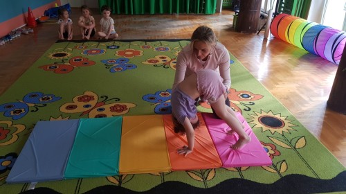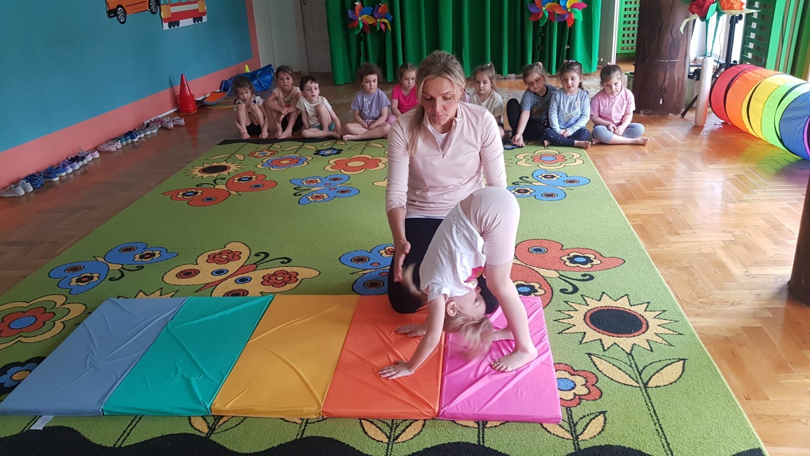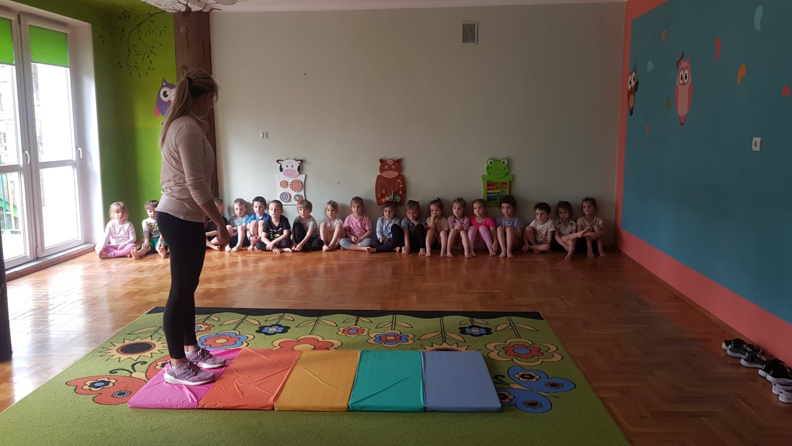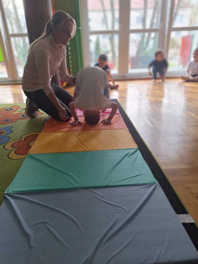 Dzieci uczestniczyły w aktywnościach ruchowych rozwijających sprawność fizyczną, koordynację oraz równowagę. Podczas ćwiczeń na matach gimnastycznych przedszkolaki ćwiczyły fikołki oraz stanie na rękach przy ścianie z asekuracją prowadzącej Pani Jagody. Nie zabrakło także ćwiczeń wspierających motorykę małą. Dzieci pracowały z miękkimi piłeczkami sensorycznymi, ściskając je i wykonując zadania rozwijające siłę dłoni. Zajęcia odbywały się w atmosferze zabawy, wzajemnego wsparcia i radości z podejmowania nowych wyzwań. Dzieci z dużym zaangażowaniem wykonywały ćwiczenia, a każdy sukces był nagradzany brawami. :)