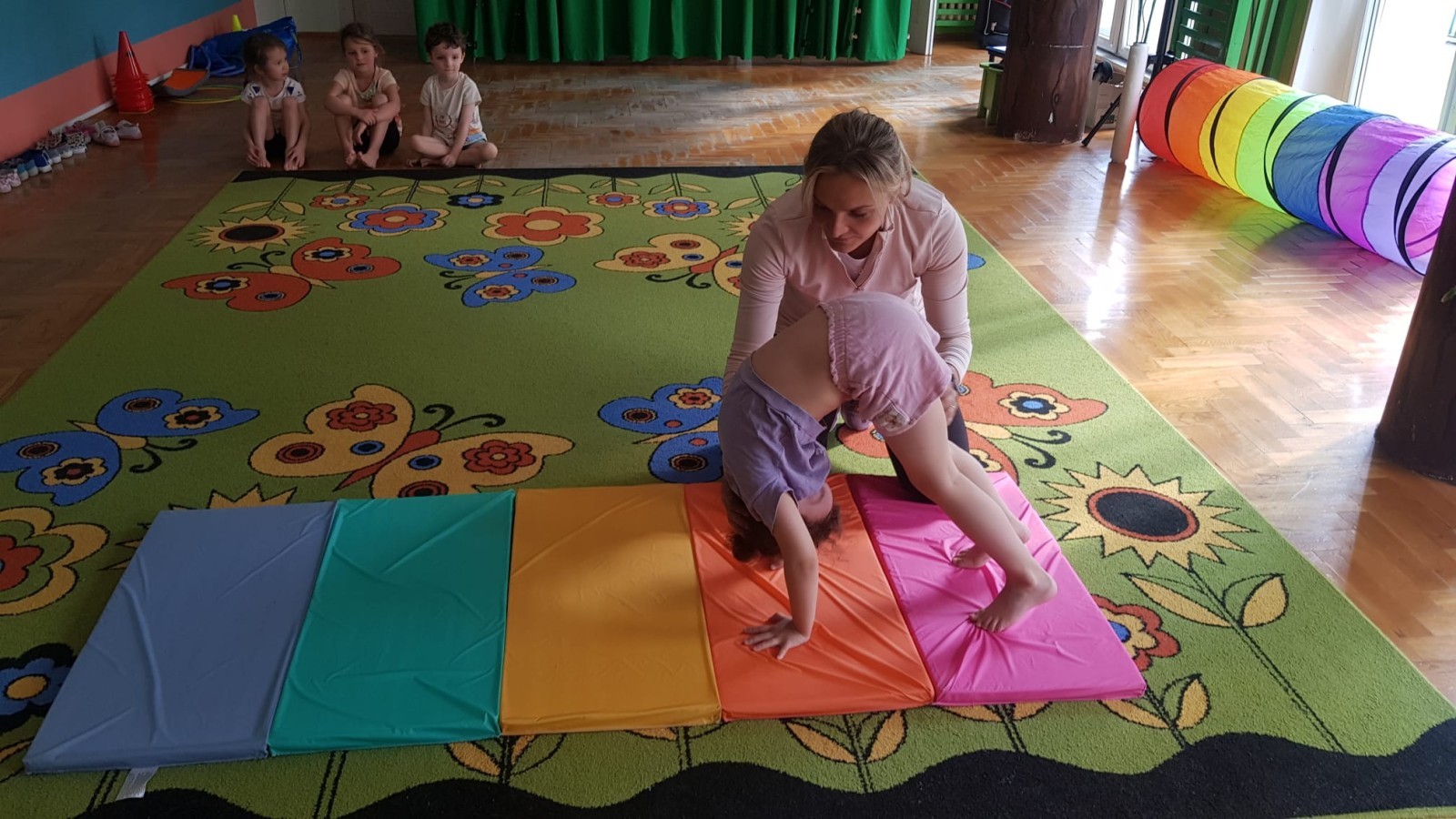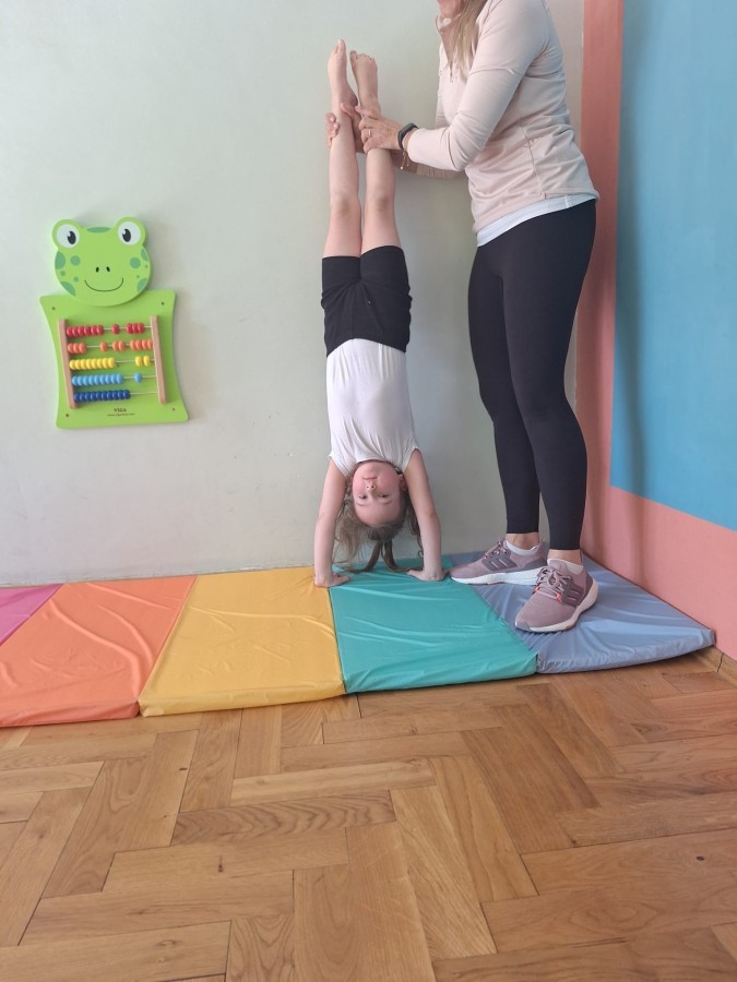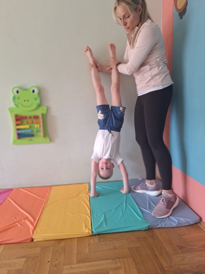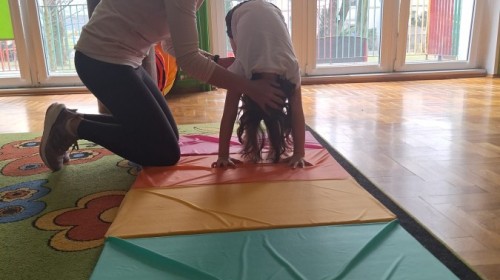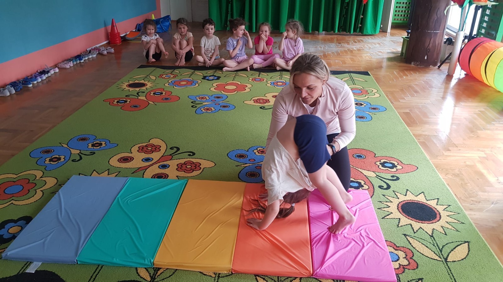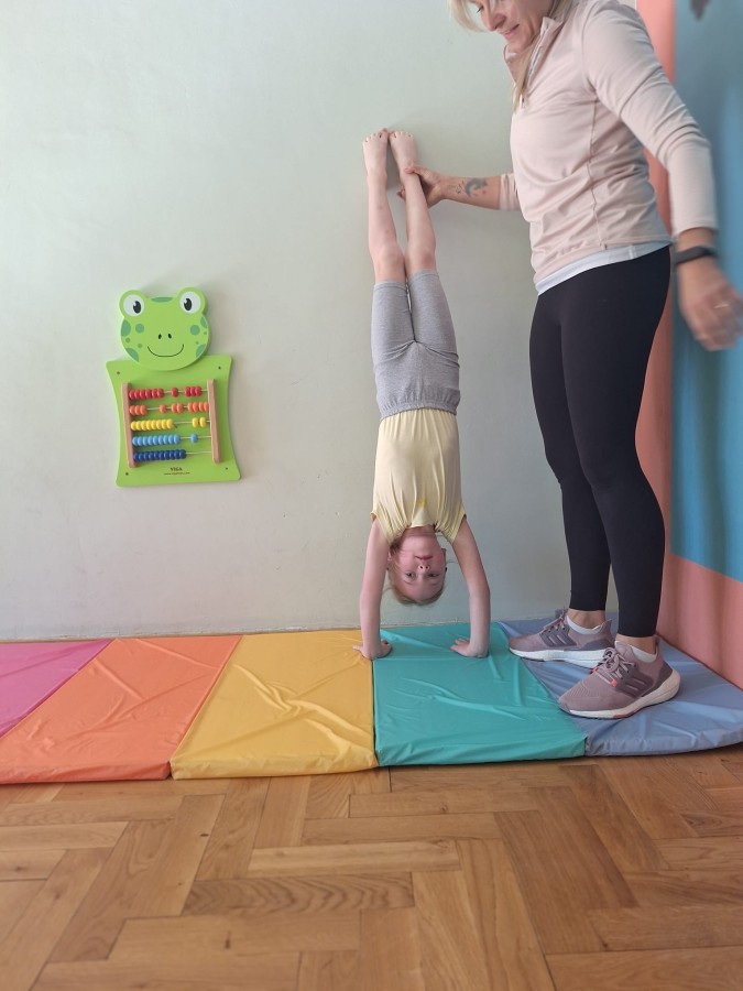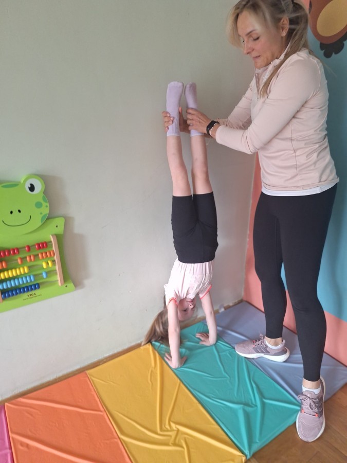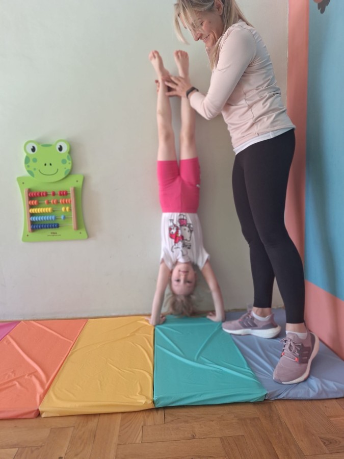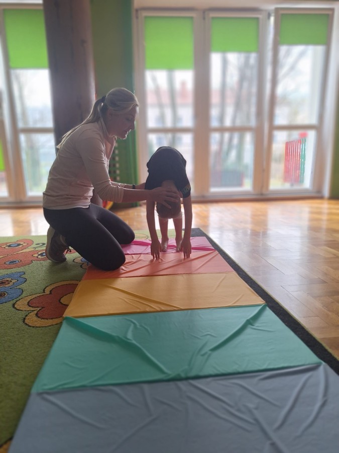 Dzieci uczestniczyły w aktywnościach ruchowych rozwijających sprawność fizyczną, koordynację oraz równowagę. Podczas ćwiczeń na matach gimnastycznych przedszkolaki ćwiczyły fikołki oraz stanie na rękach przy ścianie z asekuracją prowadzącej Pani Jagody. Nie zabrakło także ćwiczeń wspierających motorykę małą. Dzieci pracowały z miękkimi piłeczkami sensorycznymi, ściskając je i wykonując zadania rozwijające siłę dłoni. Zajęcia odbywały się w atmosferze zabawy, wzajemnego wsparcia i radości z podejmowania nowych wyzwań. Dzieci z dużym zaangażowaniem wykonywały ćwiczenia, a każdy sukces był nagradzany brawami. :)