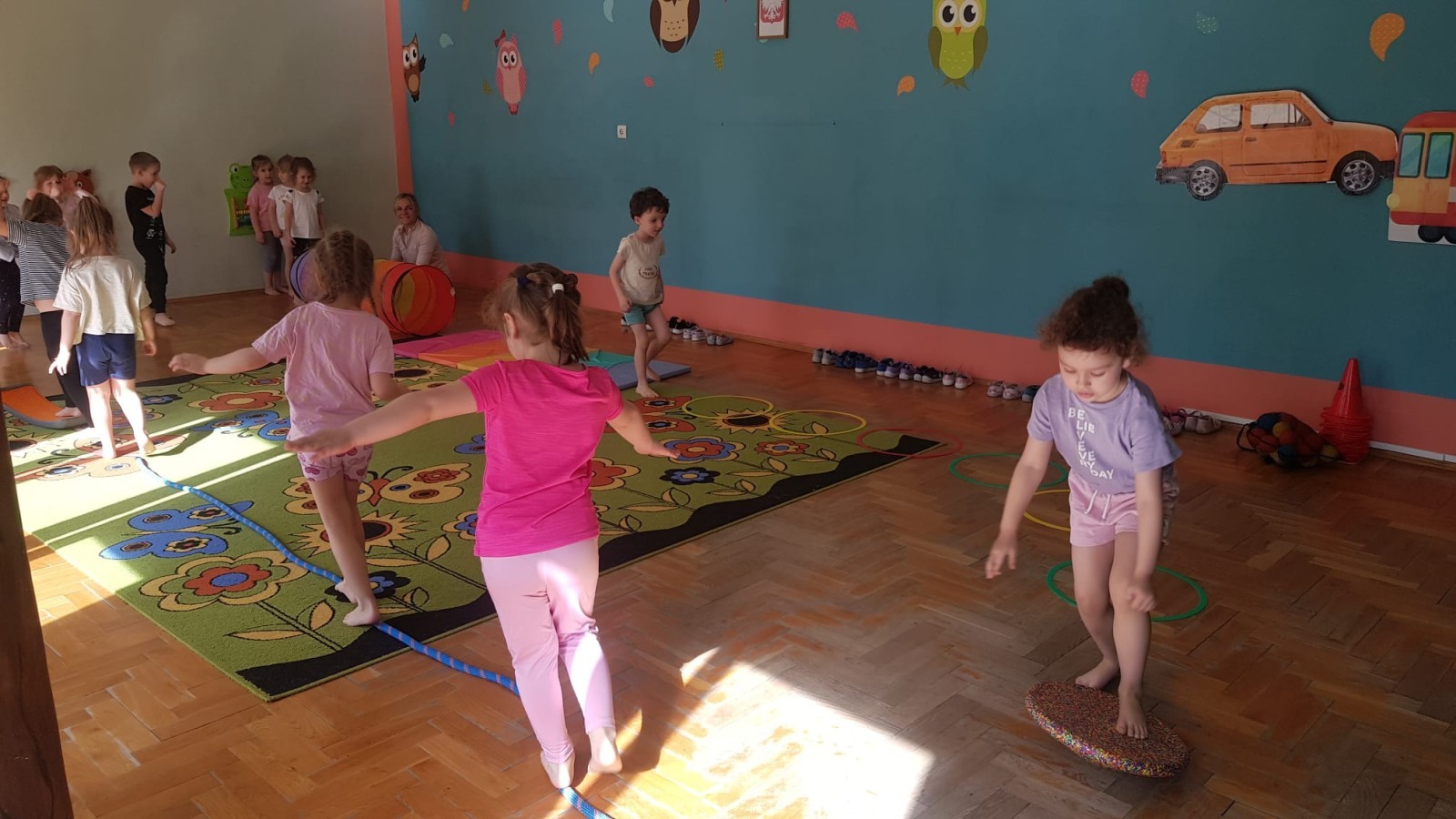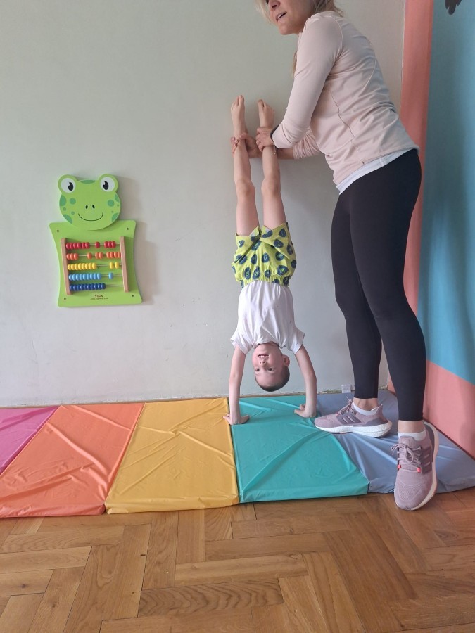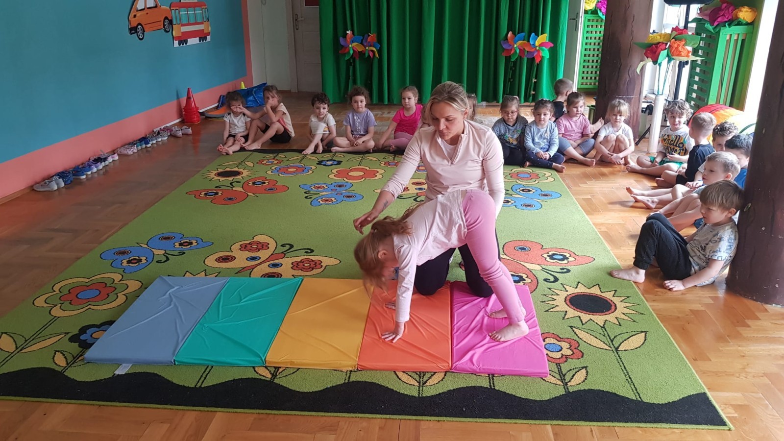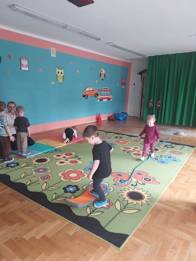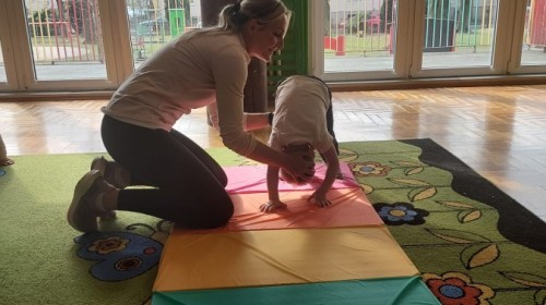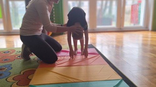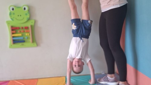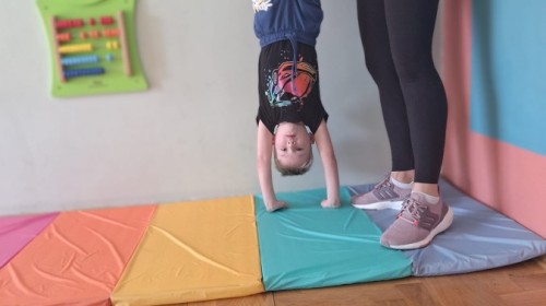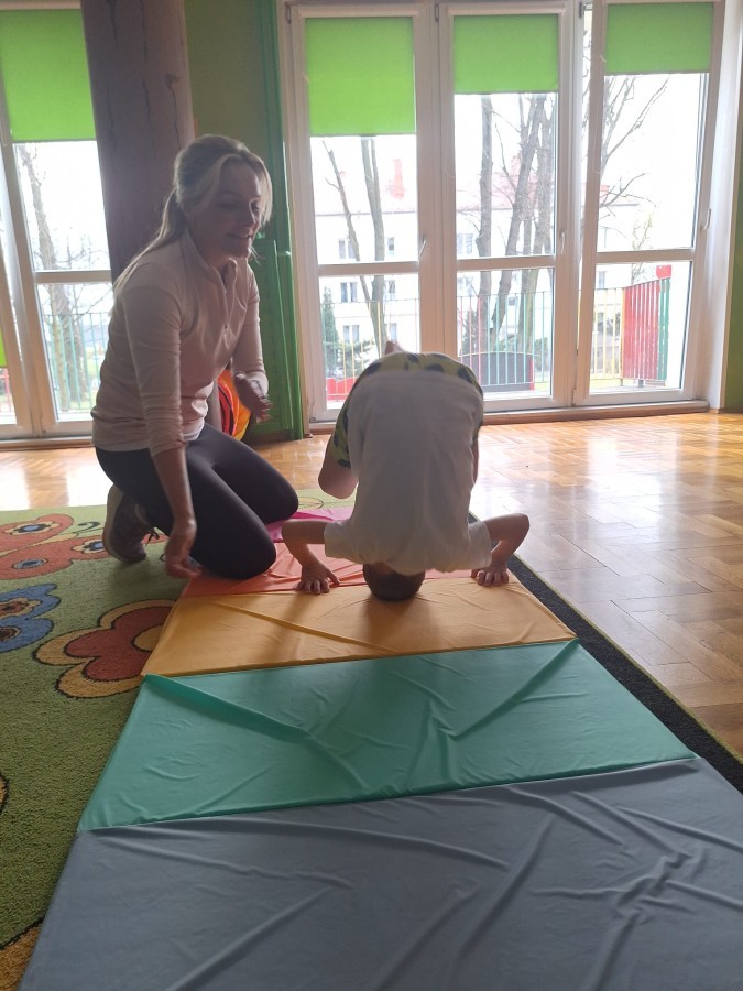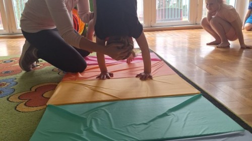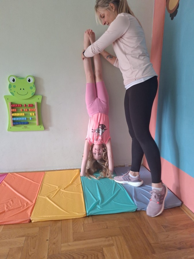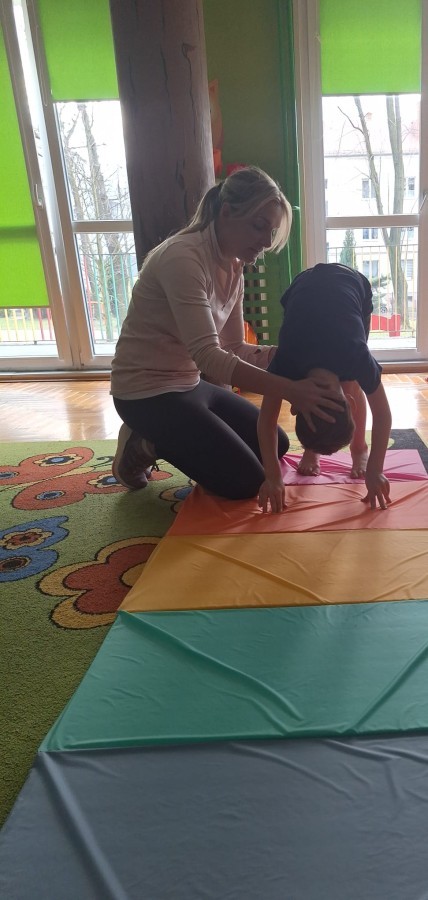 Dzieci uczestniczyły w aktywnościach ruchowych rozwijających sprawność fizyczną, koordynację oraz równowagę. Podczas ćwiczeń na matach gimnastycznych przedszkolaki ćwiczyły fikołki oraz stanie na rękach przy ścianie z asekuracją prowadzącej Pani Jagody. Nie zabrakło także ćwiczeń wspierających motorykę małą. Dzieci pracowały z miękkimi piłeczkami sensorycznymi, ściskając je i wykonując zadania rozwijające siłę dłoni. Zajęcia odbywały się w atmosferze zabawy, wzajemnego wsparcia i radości z podejmowania nowych wyzwań. Dzieci z dużym zaangażowaniem wykonywały ćwiczenia, a każdy sukces był nagradzany brawami. :)