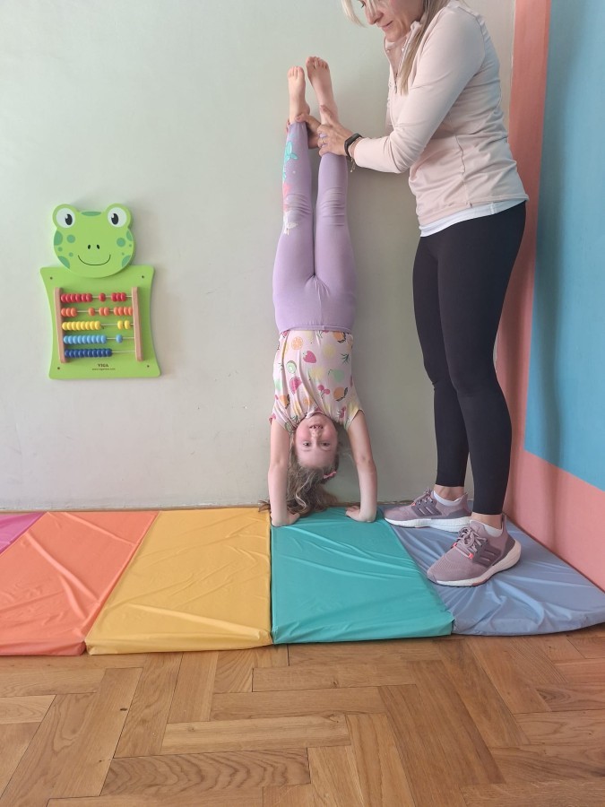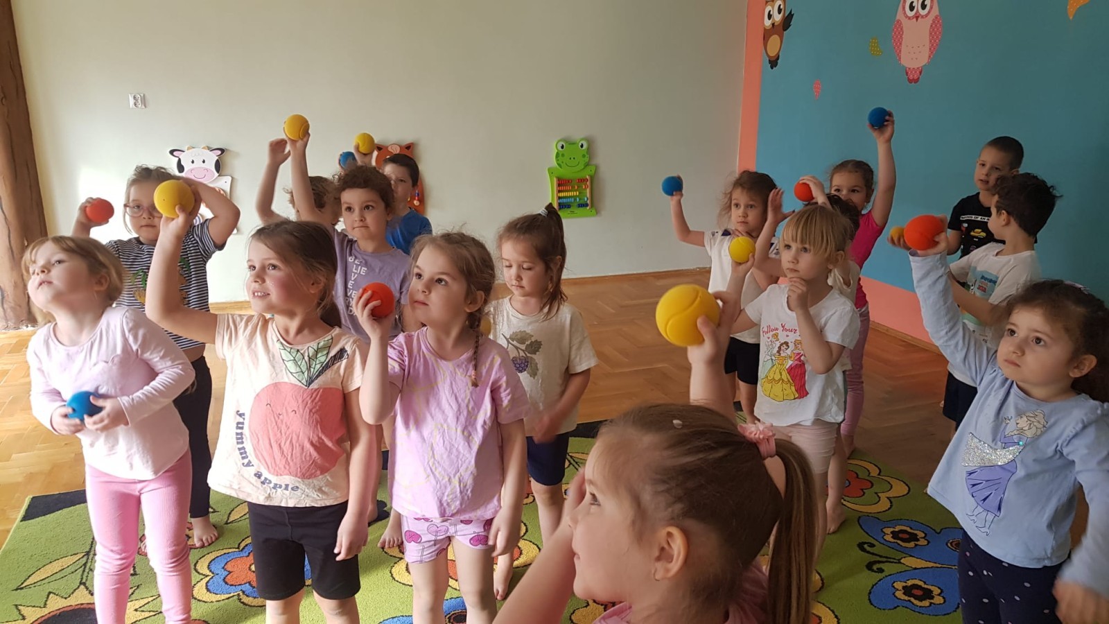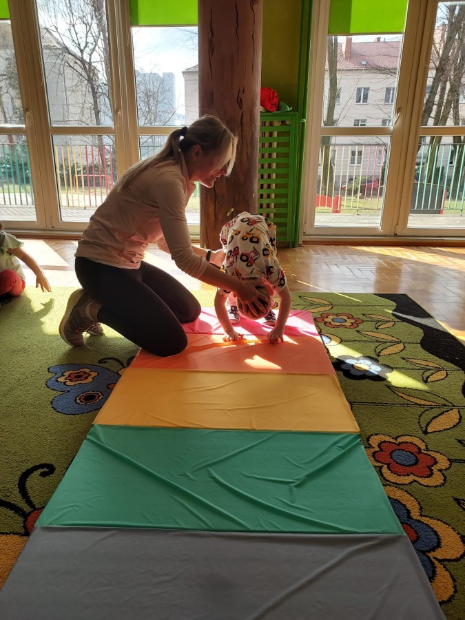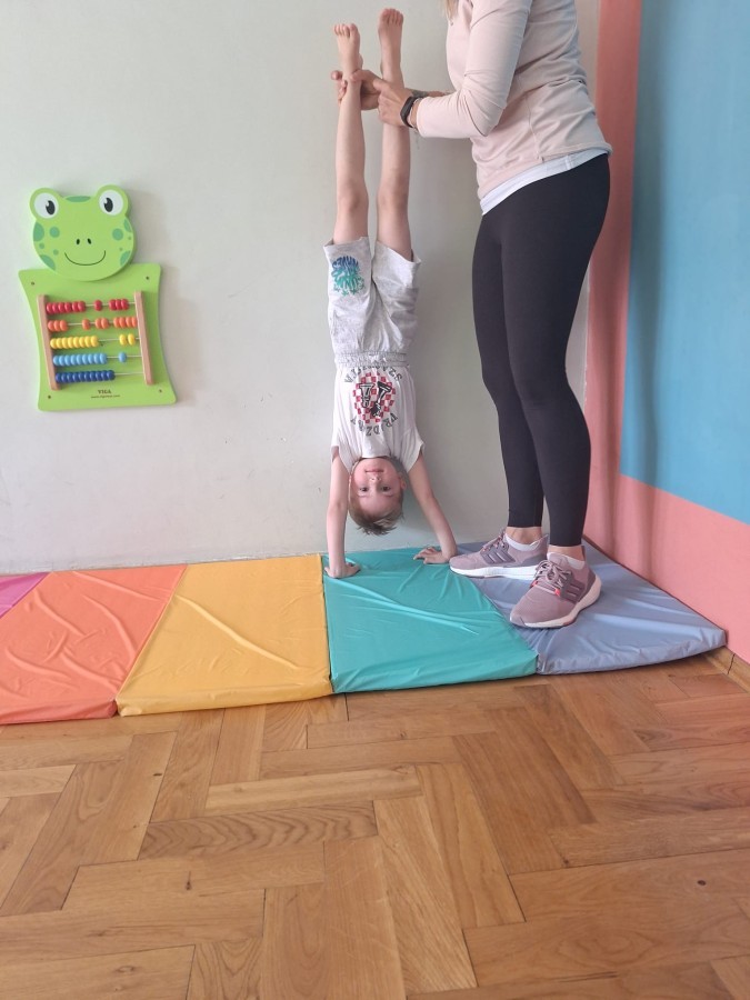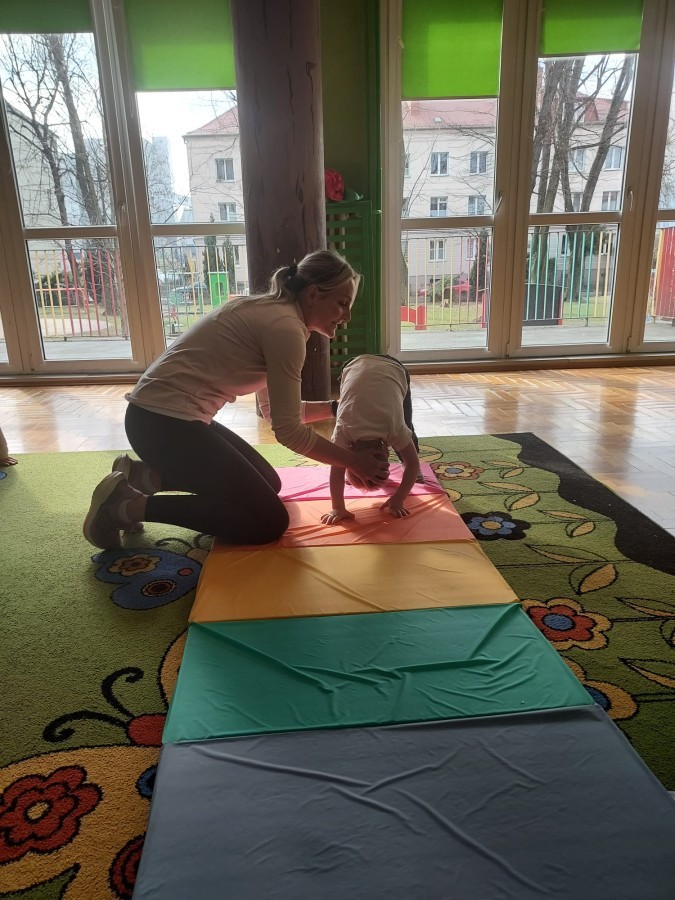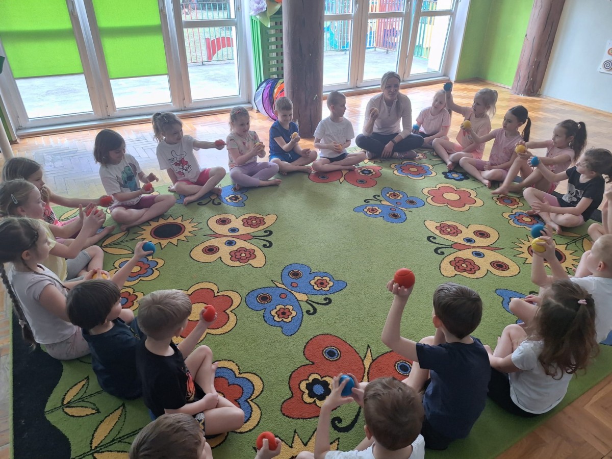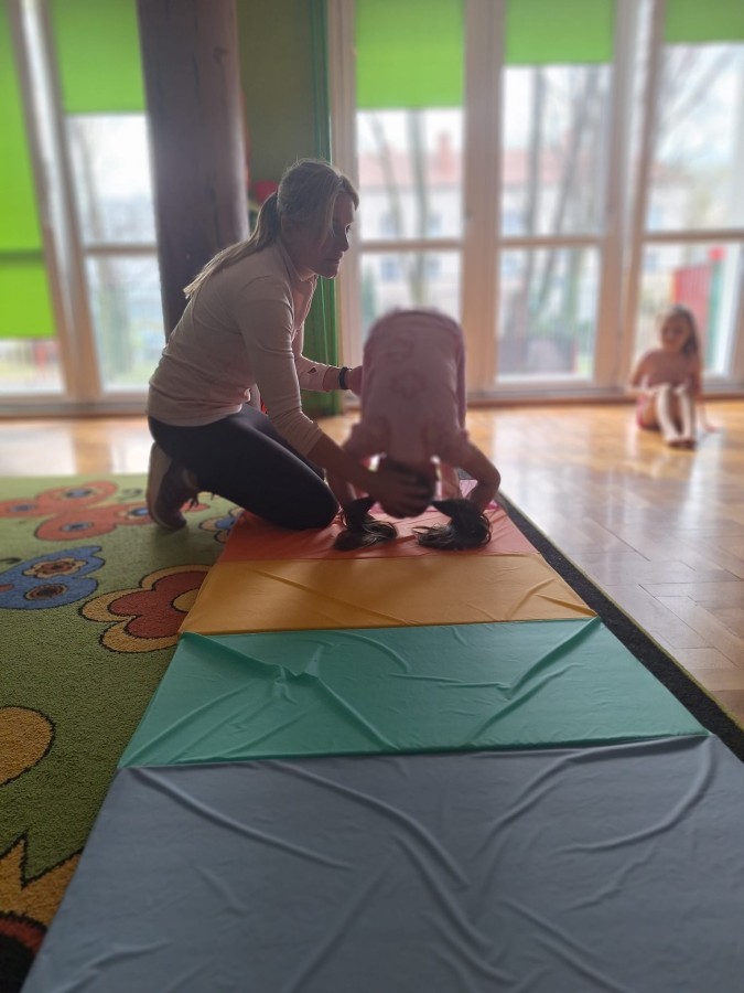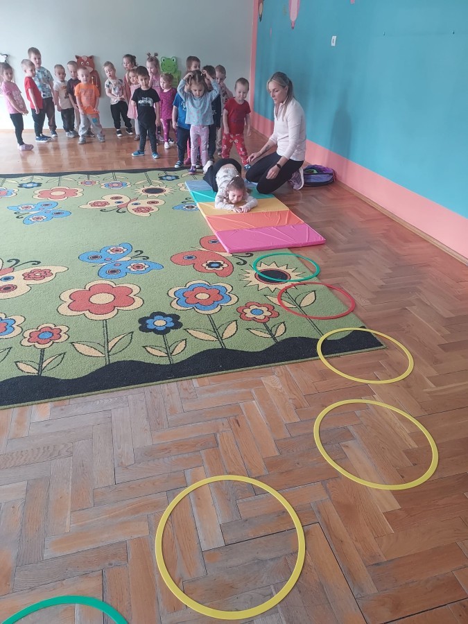 Dzieci uczestniczyły w aktywnościach ruchowych rozwijających sprawność fizyczną, koordynację oraz równowagę. Podczas ćwiczeń na matach gimnastycznych przedszkolaki ćwiczyły fikołki oraz stanie na rękach przy ścianie z asekuracją prowadzącej Pani Jagody. Nie zabrakło także ćwiczeń wspierających motorykę małą. Dzieci pracowały z miękkimi piłeczkami sensorycznymi, ściskając je i wykonując zadania rozwijające siłę dłoni. Zajęcia odbywały się w atmosferze zabawy, wzajemnego wsparcia i radości z podejmowania nowych wyzwań. Dzieci z dużym zaangażowaniem wykonywały ćwiczenia, a każdy sukces był nagradzany brawami. :)