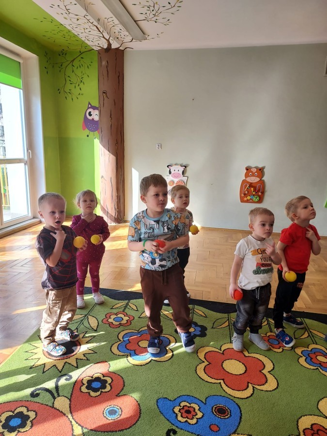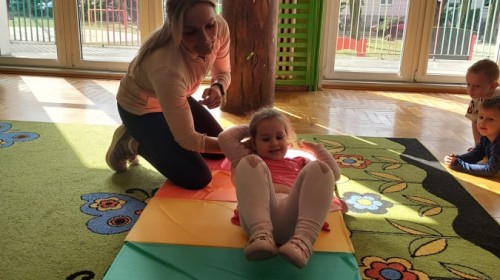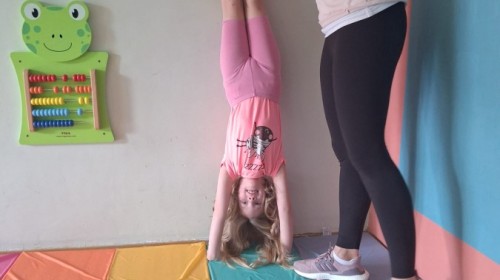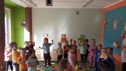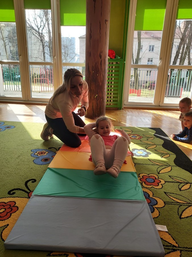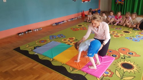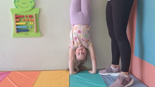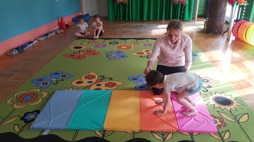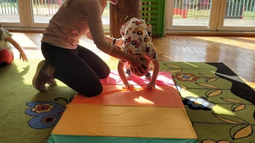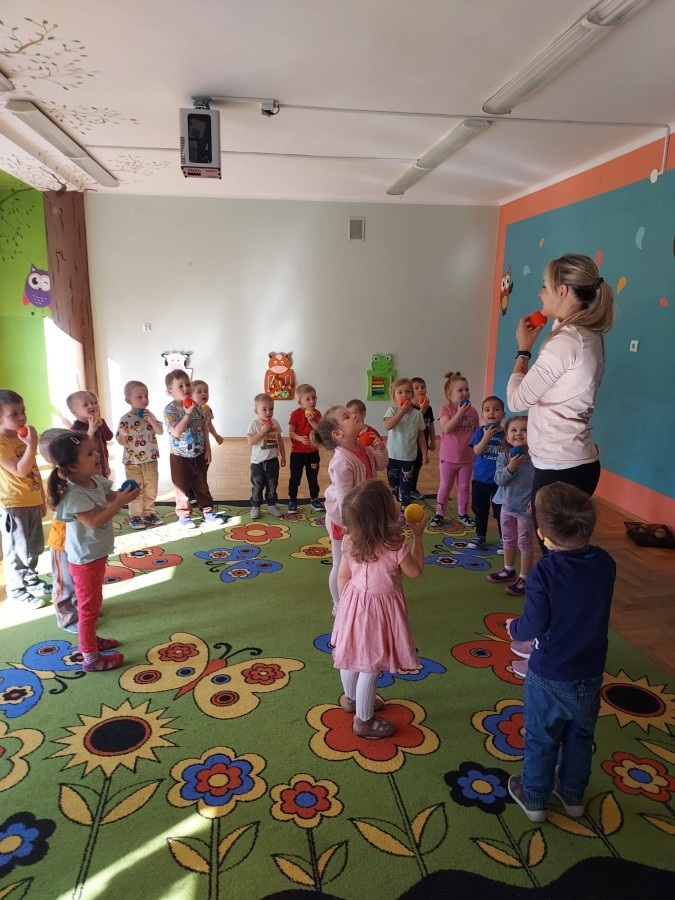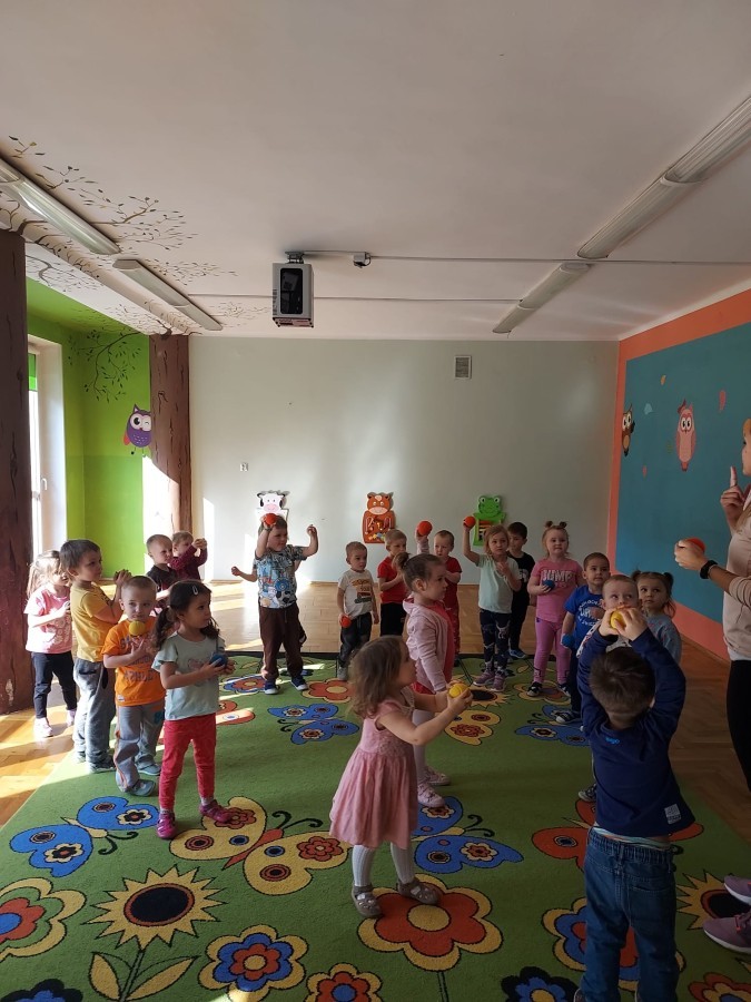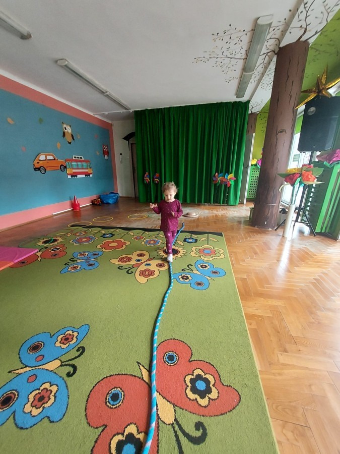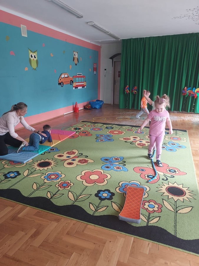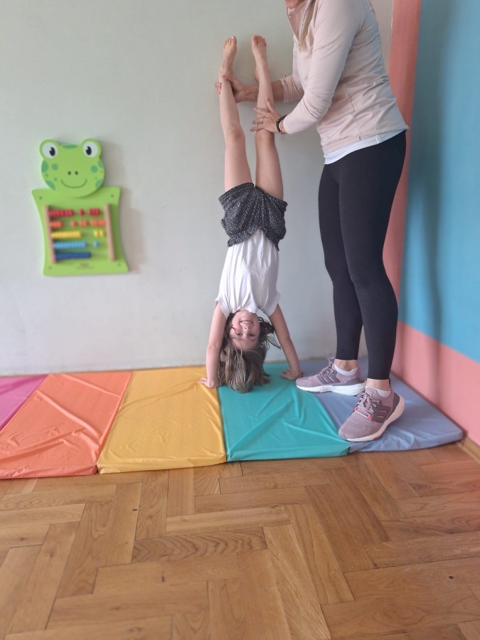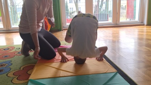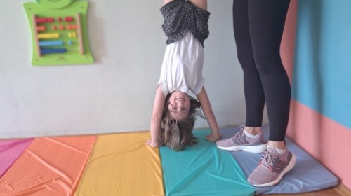 Dzieci uczestniczyły w aktywnościach ruchowych rozwijających sprawność fizyczną, koordynację oraz równowagę. Podczas ćwiczeń na matach gimnastycznych przedszkolaki ćwiczyły fikołki oraz stanie na rękach przy ścianie z asekuracją prowadzącej Pani Jagody. Nie zabrakło także ćwiczeń wspierających motorykę małą. Dzieci pracowały z miękkimi piłeczkami sensorycznymi, ściskając je i wykonując zadania rozwijające siłę dłoni. Zajęcia odbywały się w atmosferze zabawy, wzajemnego wsparcia i radości z podejmowania nowych wyzwań. Dzieci z dużym zaangażowaniem wykonywały ćwiczenia, a każdy sukces był nagradzany brawami. :)