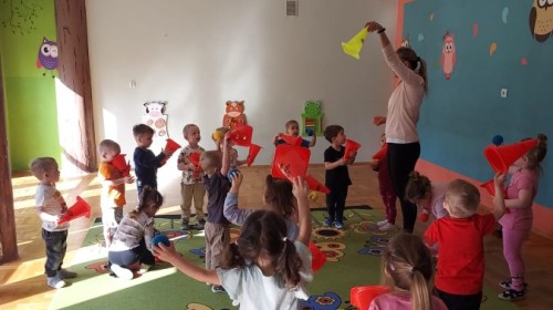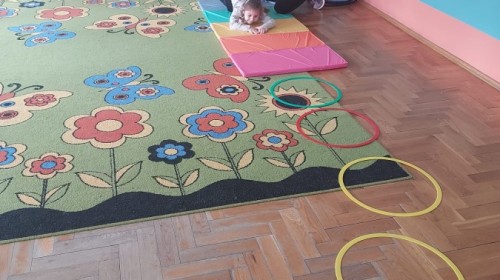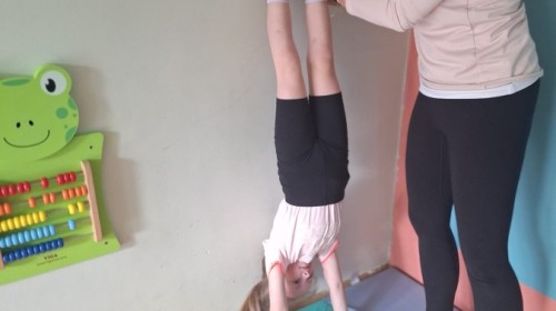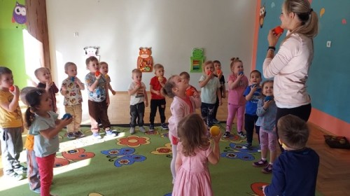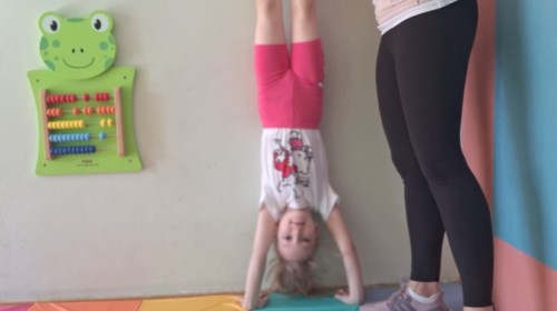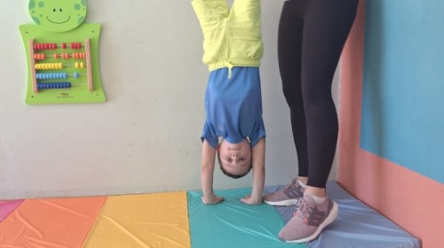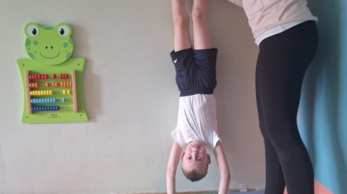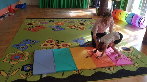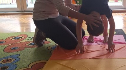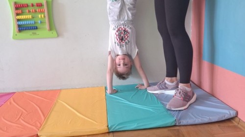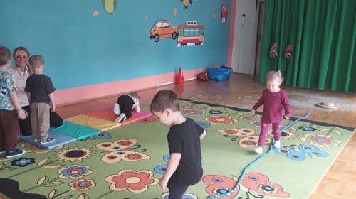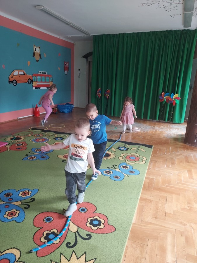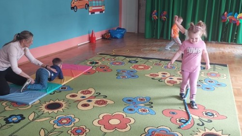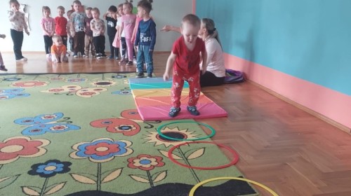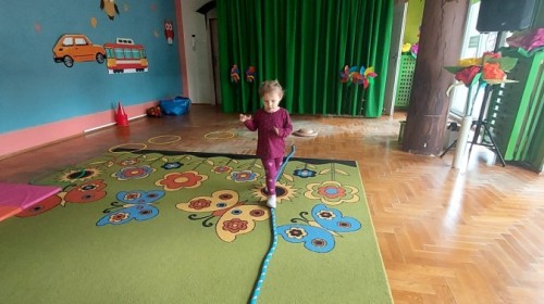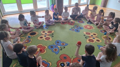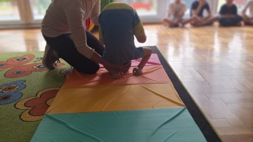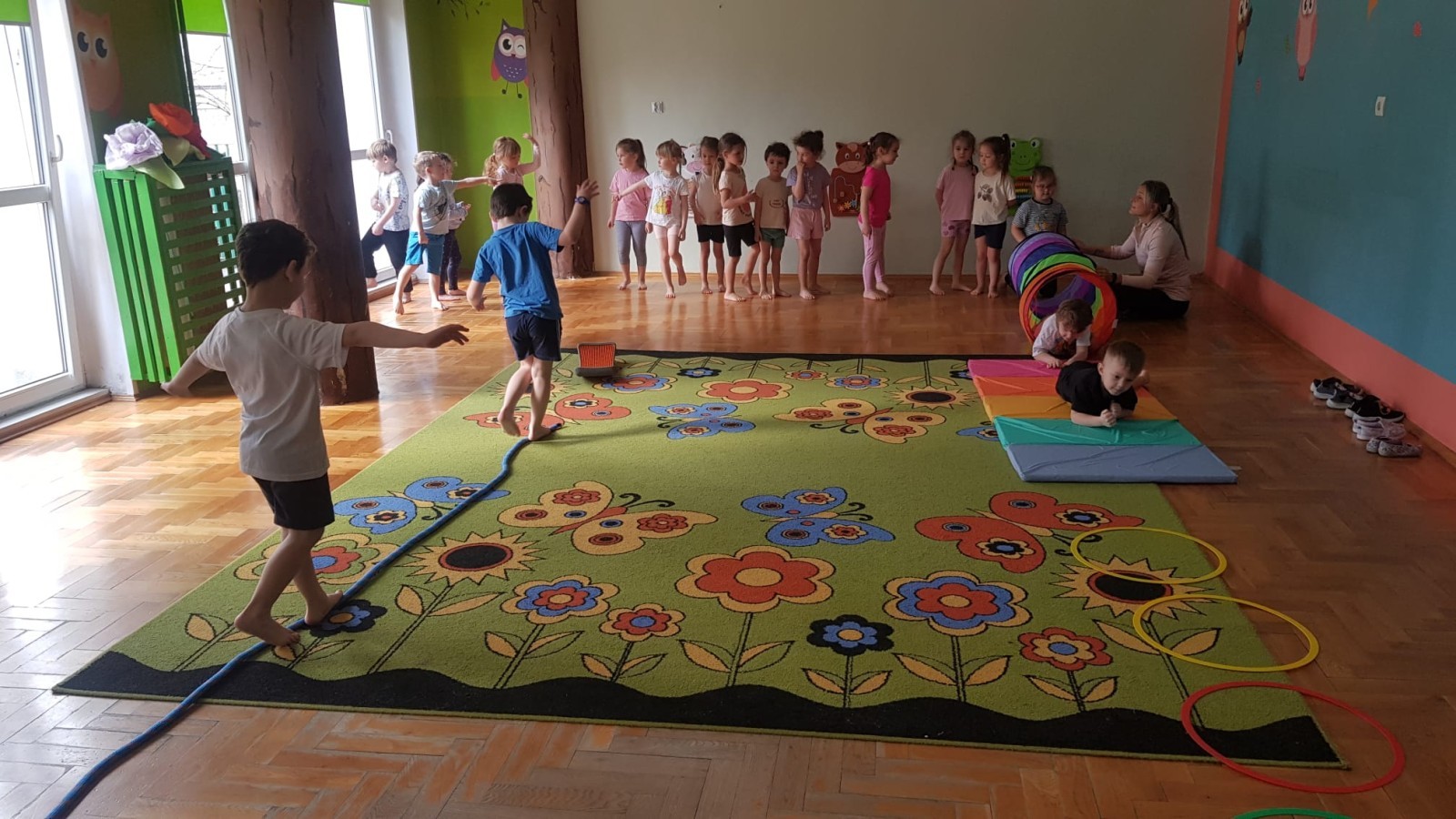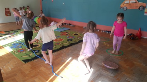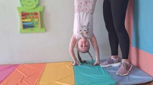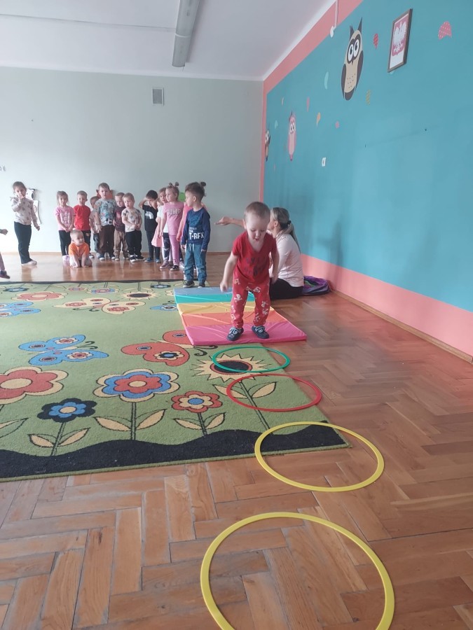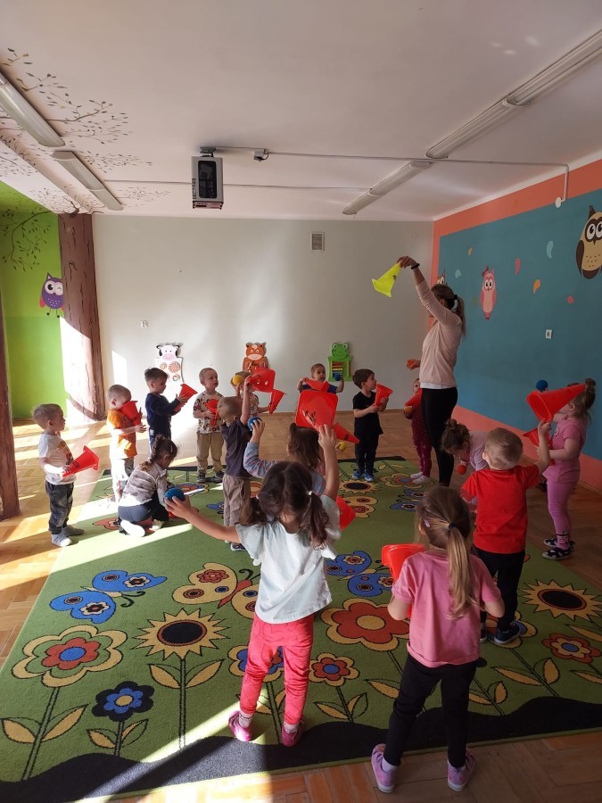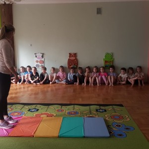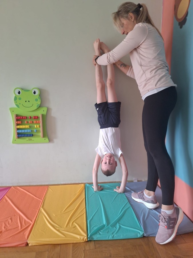 Dzieci uczestniczyły w aktywnościach ruchowych rozwijających sprawność fizyczną, koordynację oraz równowagę. Podczas ćwiczeń na matach gimnastycznych przedszkolaki ćwiczyły fikołki oraz stanie na rękach przy ścianie z asekuracją prowadzącej Pani Jagody. Nie zabrakło także ćwiczeń wspierających motorykę małą. Dzieci pracowały z miękkimi piłeczkami sensorycznymi, ściskając je i wykonując zadania rozwijające siłę dłoni. Zajęcia odbywały się w atmosferze zabawy, wzajemnego wsparcia i radości z podejmowania nowych wyzwań. Dzieci z dużym zaangażowaniem wykonywały ćwiczenia, a każdy sukces był nagradzany brawami. :)