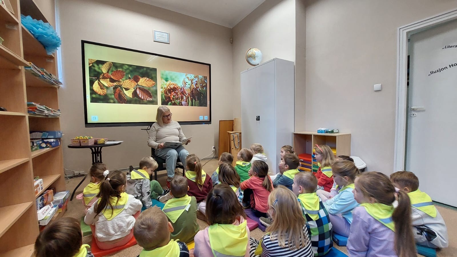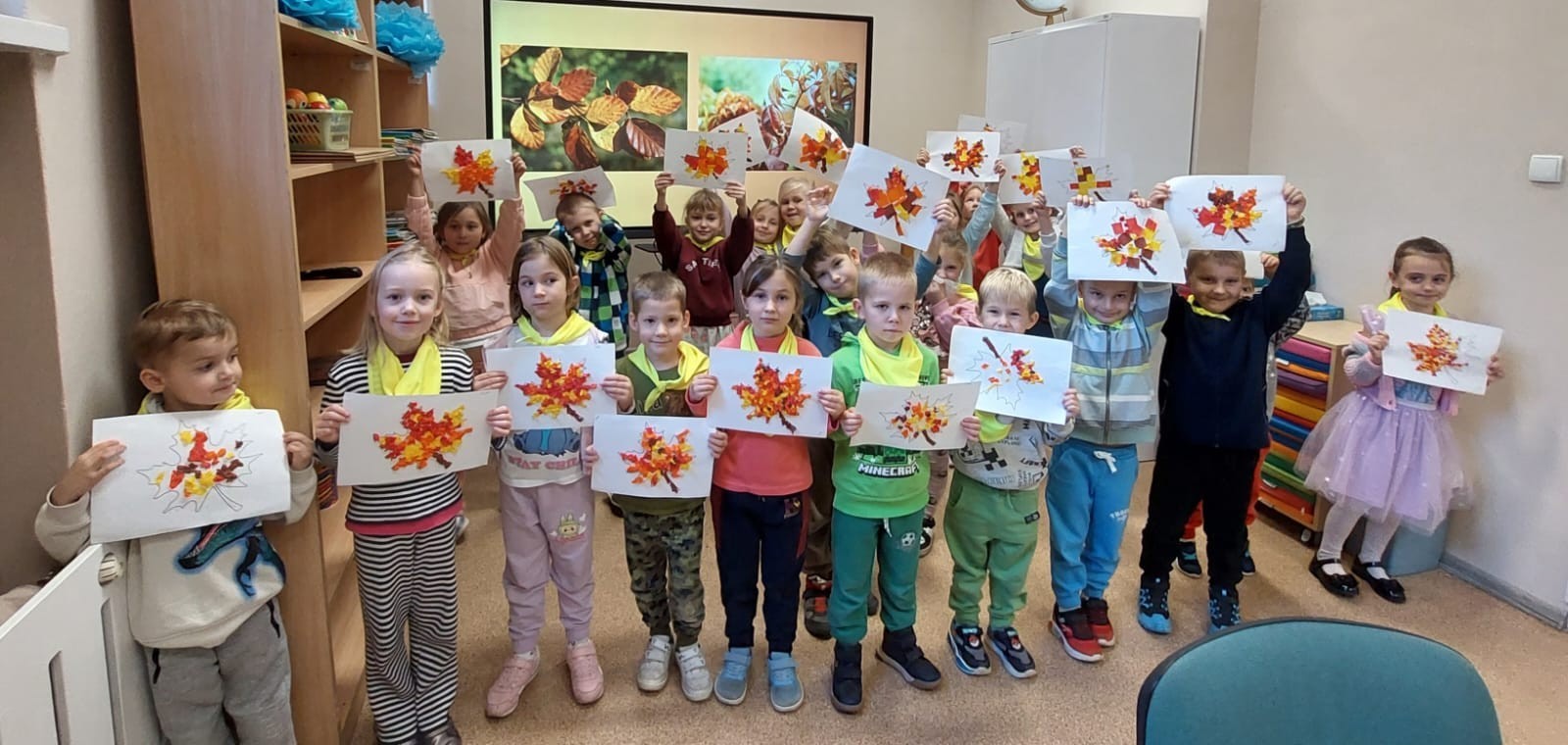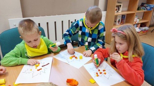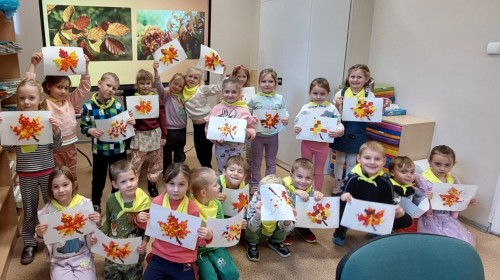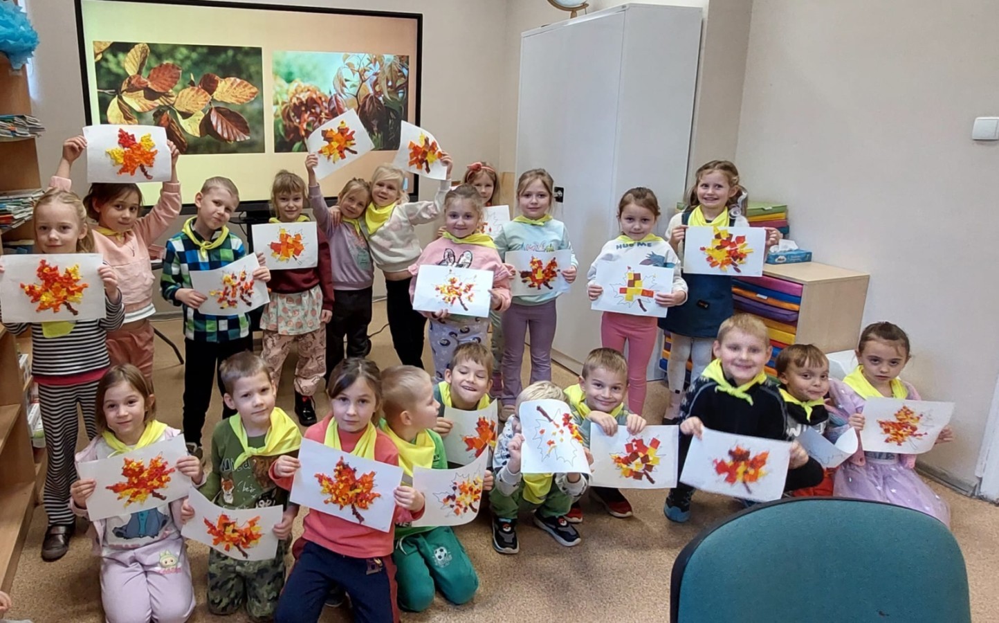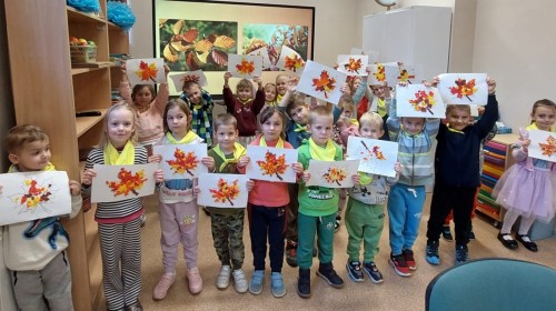 Grupa Tropiciele wybrała się dzisiaj na zajęcia do pobliskiej Biblioteki. Na zajęciach dzieci poznawały różne rodzaje drzew oraz wykonały pracę plastyczną pt. Jesienny liść.