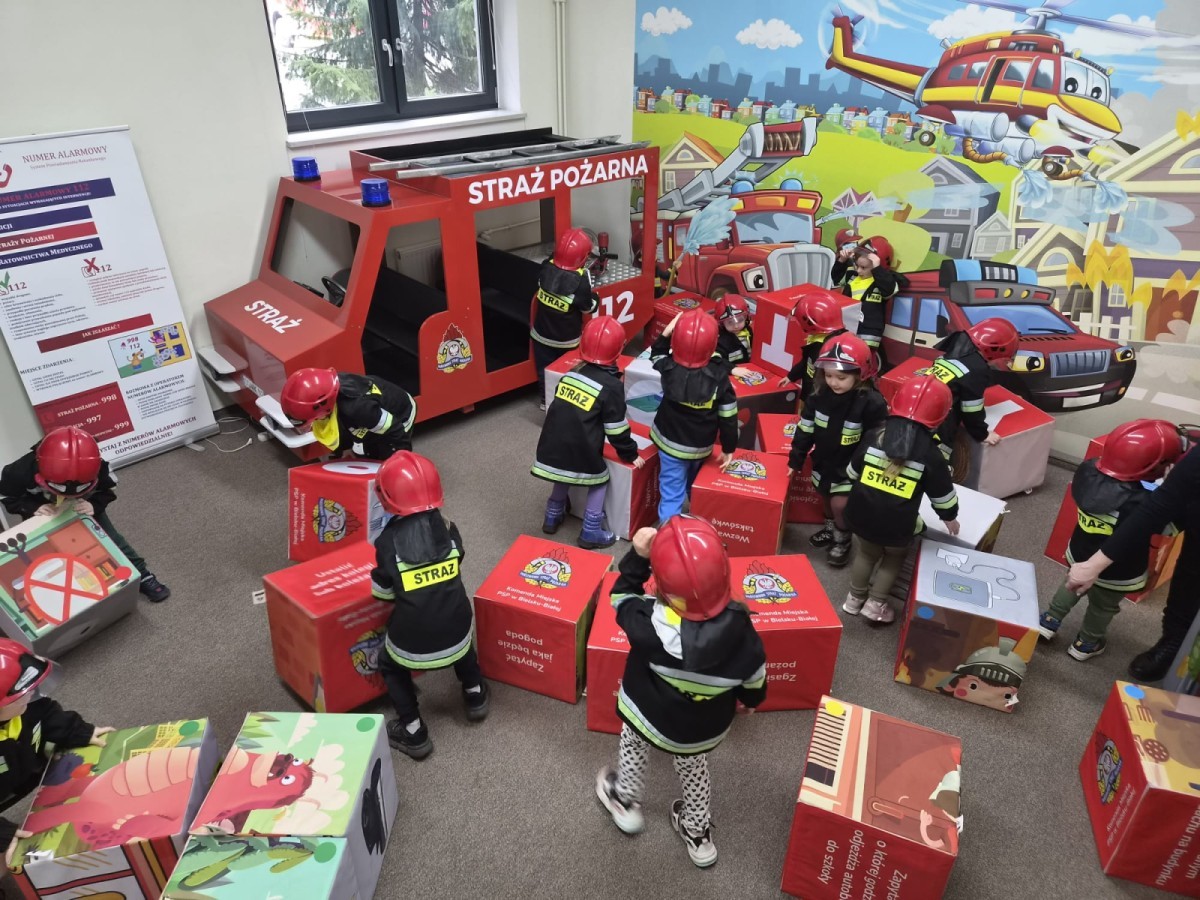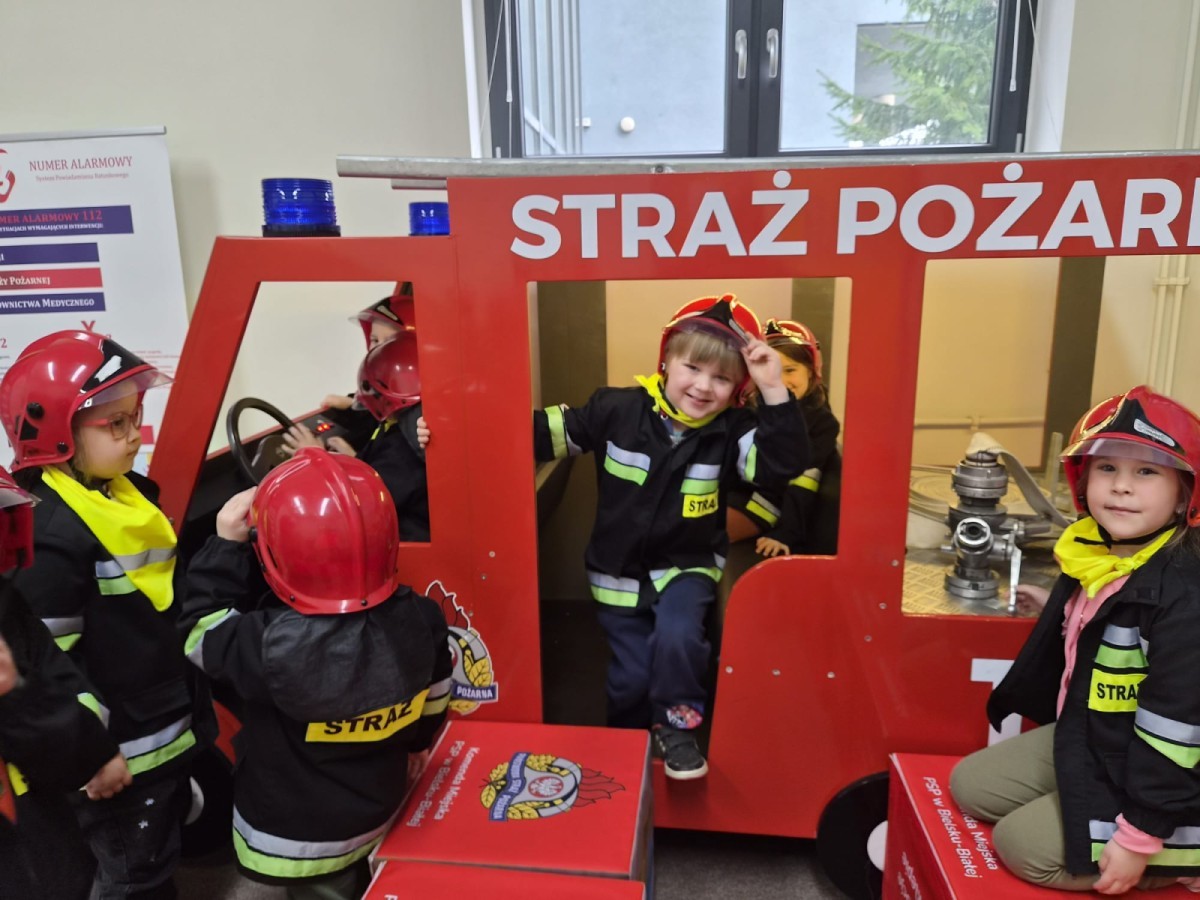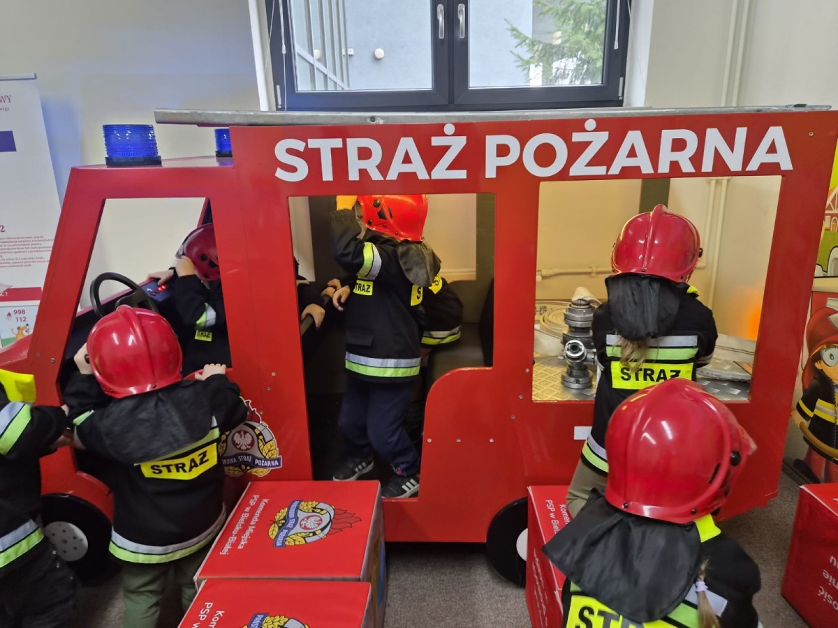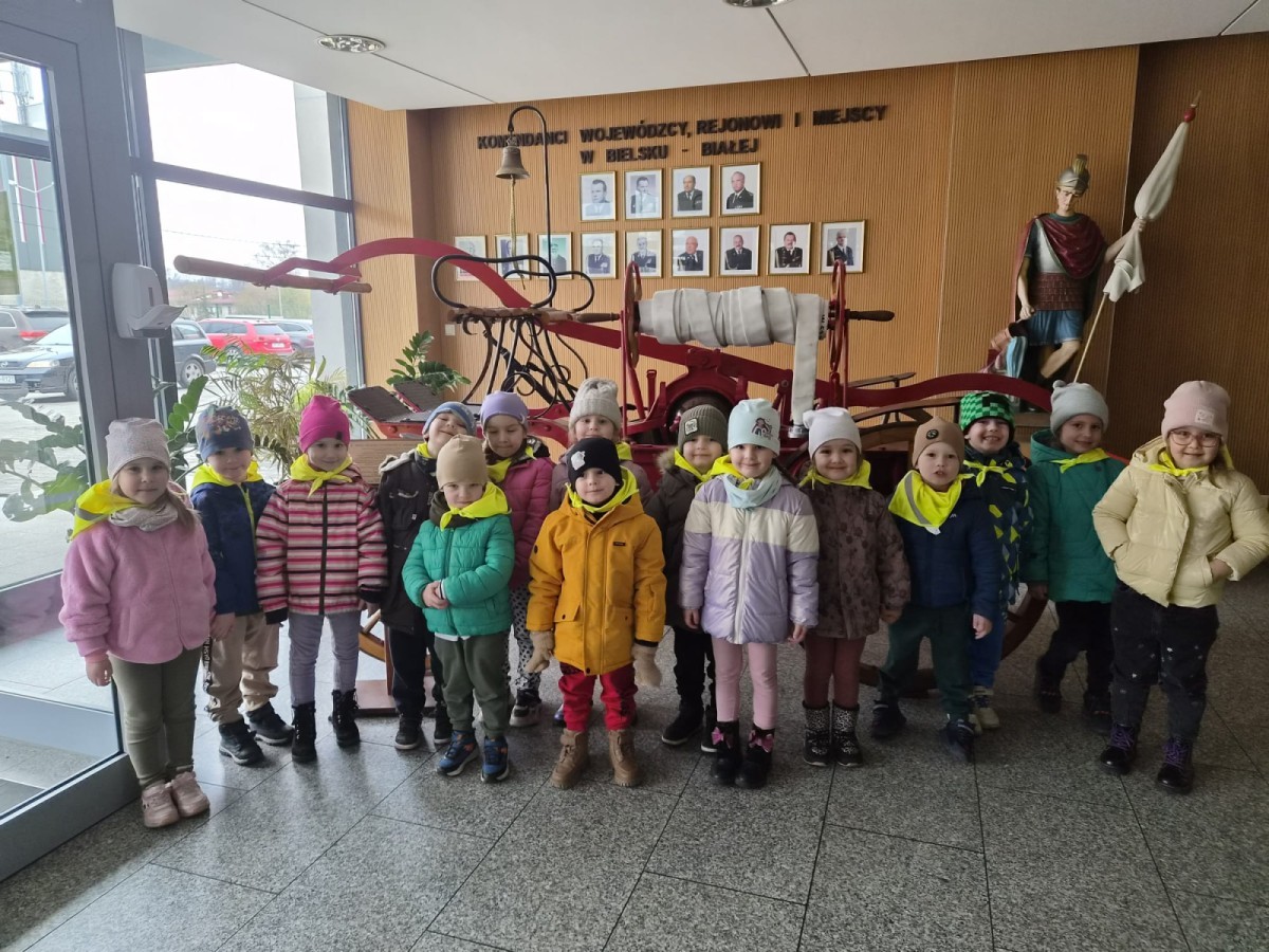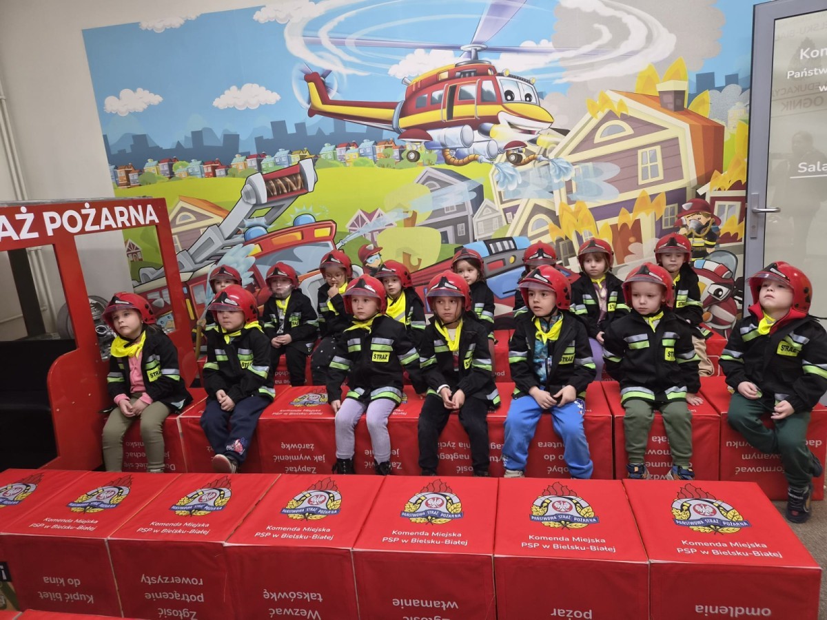 Nasze przedszkolaki miały wyjątkową okazję odwiedzić Komendę Miejską Państwowej Straży Pożarnej w Bielsku-Białej i z bliska poznać pracę strażaków. Już od pierwszych chwil emocji nie brakowało! Dzieci mogły zobaczyć prawdziwy wóz strażacki z ogromną drabiną, poznać jego wyposażenie oraz dowiedzieć się, do jakich akcji jest wykorzystywany. Największą radość sprawiło przymierzanie strażackich hełmów i specjalnych ubrań- przez chwilę każdy mógł poczuć się jak prawdziwy bohater. Podczas zajęć edukacyjnych dzieci uczyły się również zasad bezpieczeństwa oraz tego, jak należy zachować się w sytuacjach zagrożenia. Poprzez zabawę utrwalały wiedzę o numerach alarmowych i pracy służb ratunkowych.