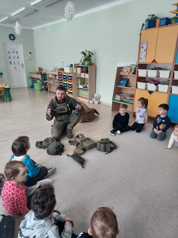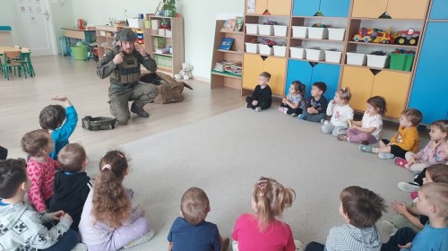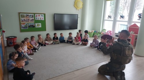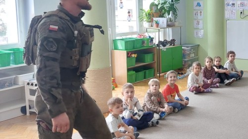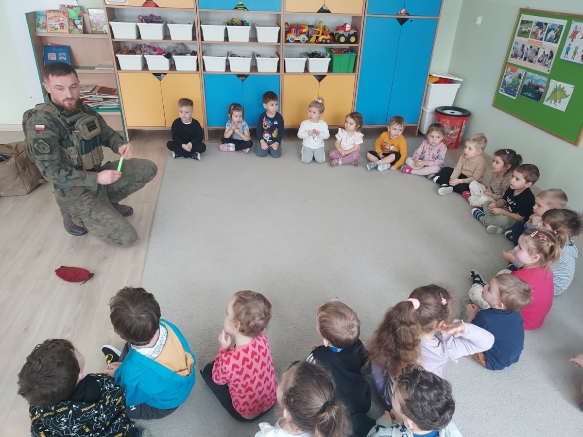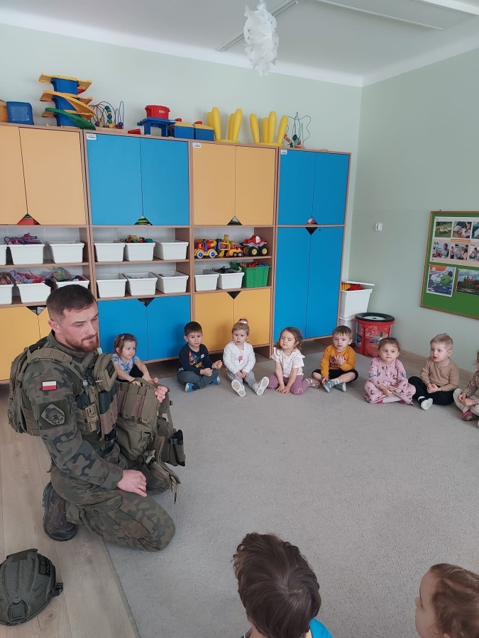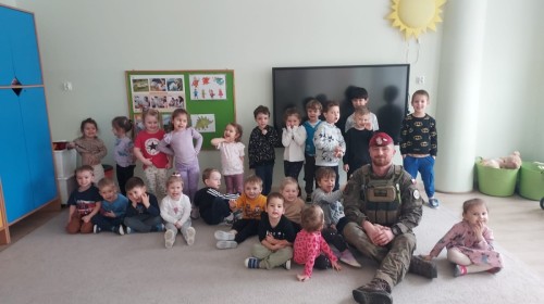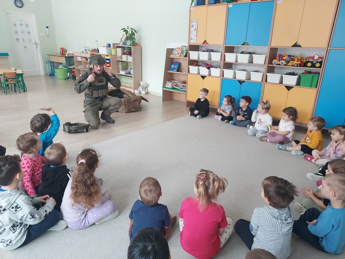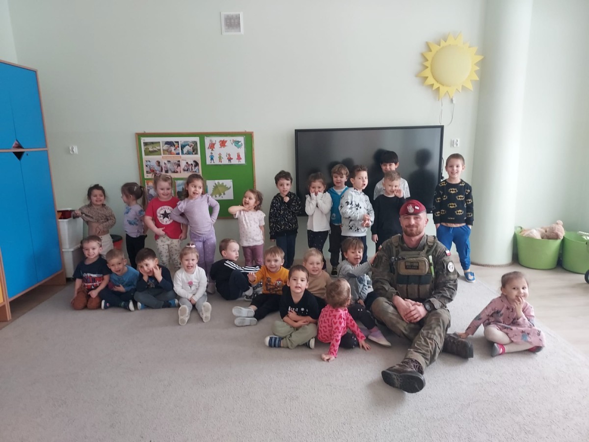 Przedszkolaki z ogromnym zainteresowaniem słuchały opowieści o służbie wojskowej, zadawały pytania i miały okazję zobaczyć elementy żołnierskiego wyposażenia. Dzieci dowiedziały się, czym jest odwaga, odpowiedzialność oraz pomoc innym :)