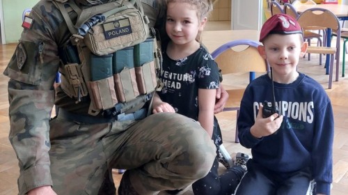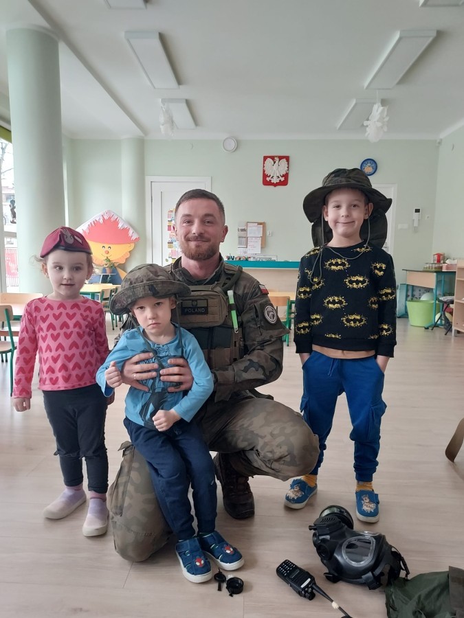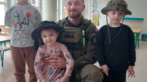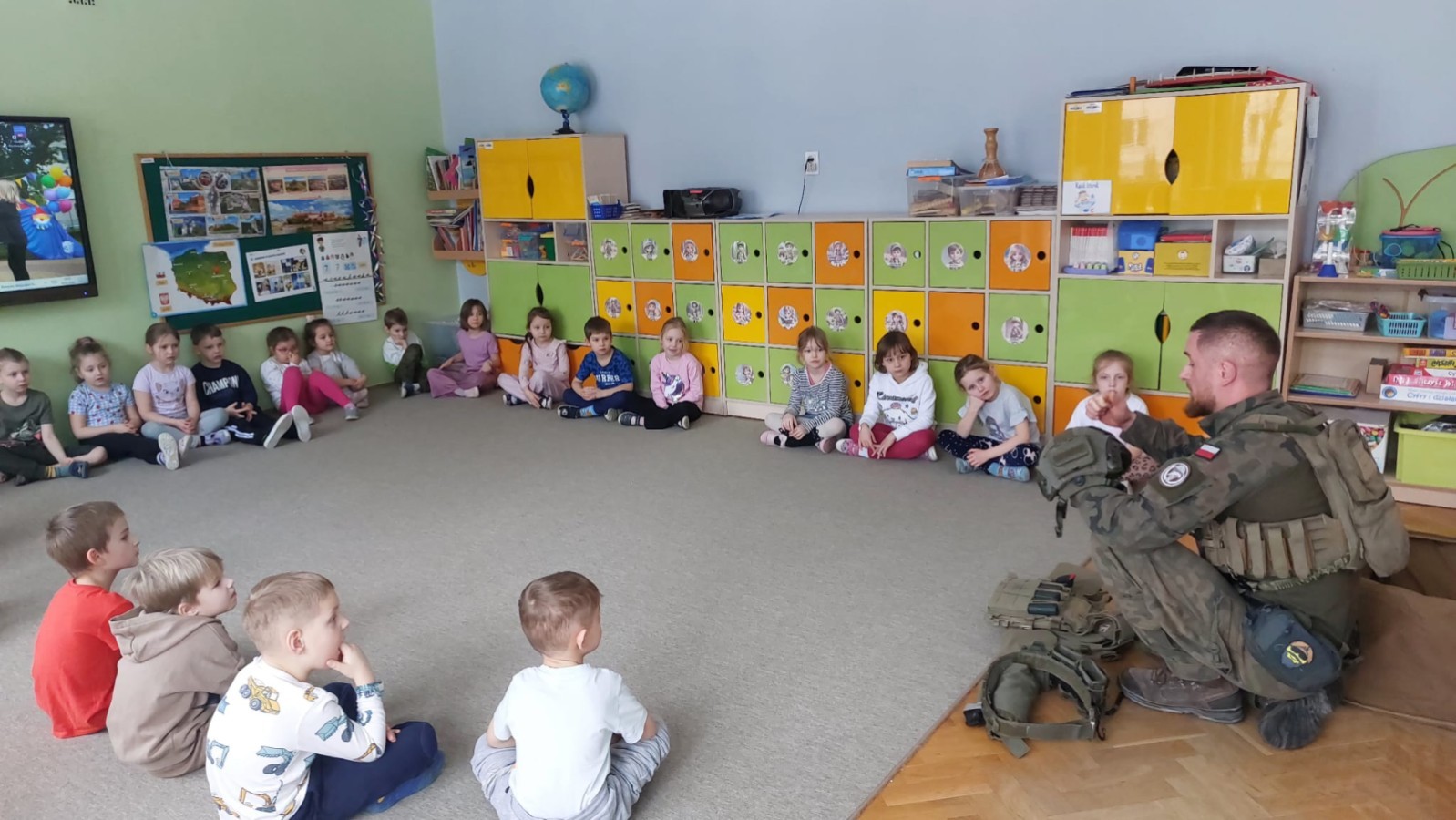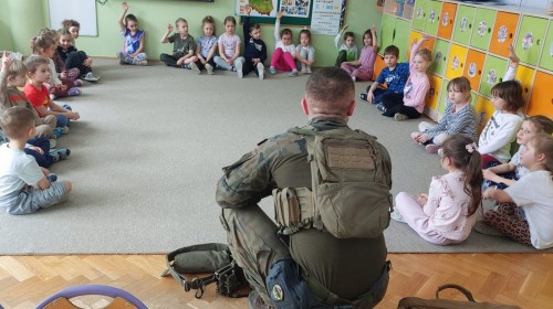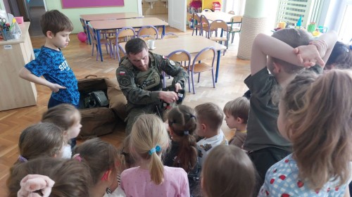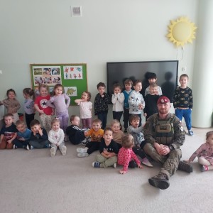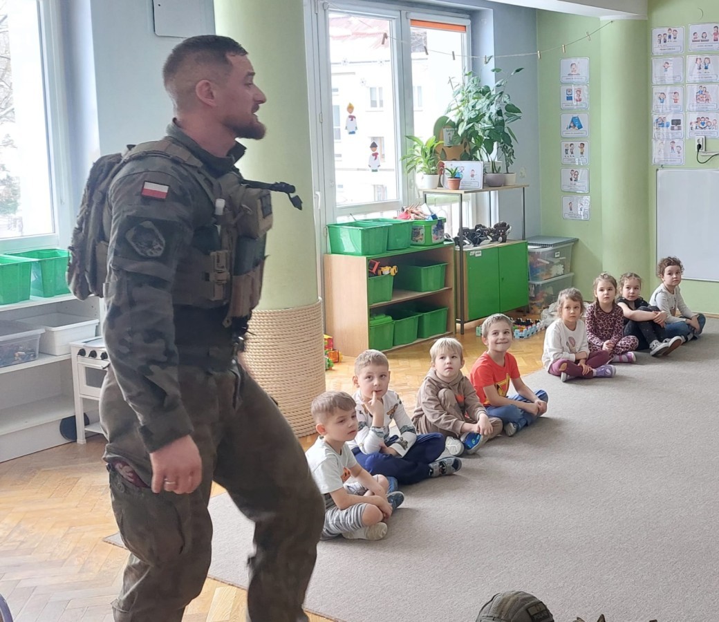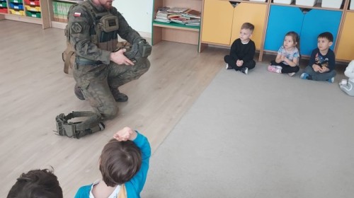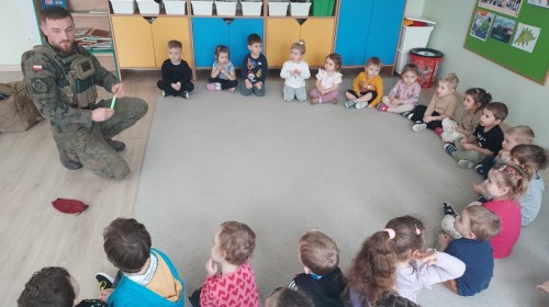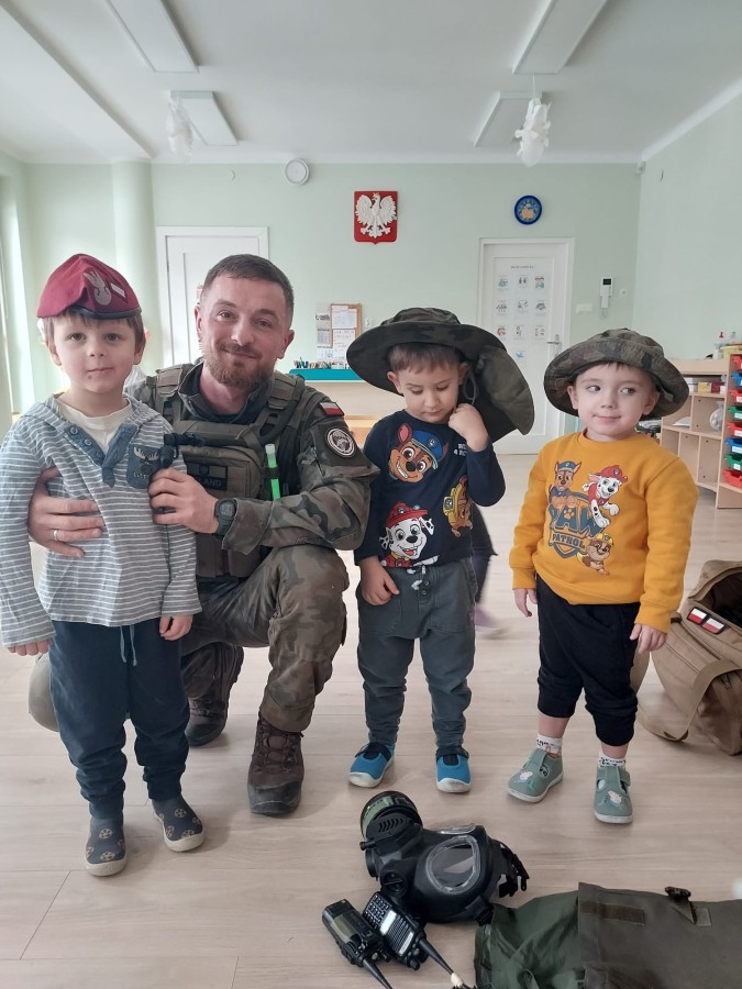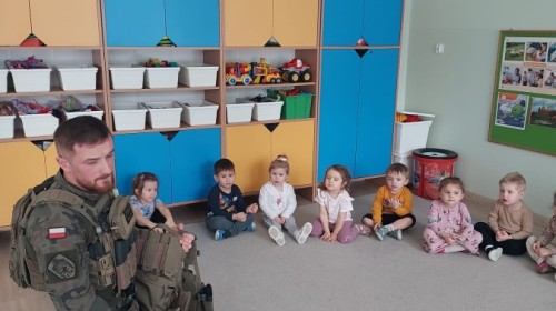 Przedszkolaki z ogromnym zainteresowaniem słuchały opowieści o służbie wojskowej, zadawały pytania i miały okazję zobaczyć elementy żołnierskiego wyposażenia. Dzieci dowiedziały się, czym jest odwaga, odpowiedzialność oraz pomoc innym :)
